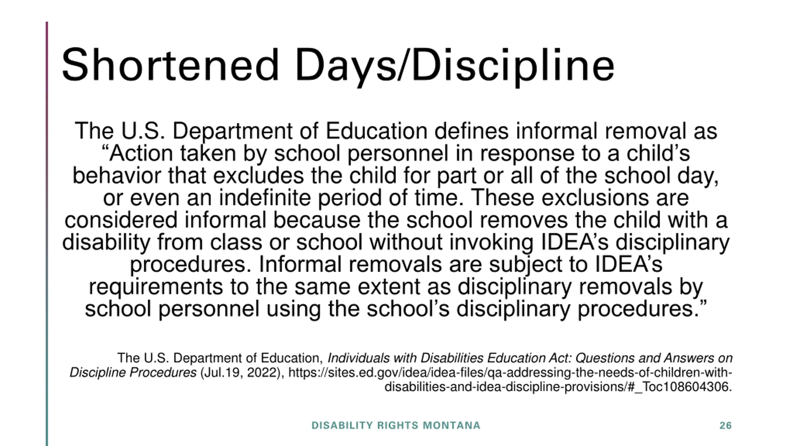 Shortened Days/Discipline The U.S. Department of Education defines informal removal as Action taken by school personnel in response to a child s behavior that excludes the child for part or all of the school day, or even an indefinite period of time. These exclusions are considered informal because the school removes the child with a disability from class or school without invoking IDEA s disciplinary procedures. Informal removals are subject to IDEA s requirements to the same extent as disciplinary removals by school personnel using the school s disciplinary procedures. The U.S. Department of Education, Individuals with Disabilities Education Act: Questions and Answers on Discipline Procedures (Jul.19, 2022), https://sites.ed.gov/idea/idea-files/qa-addressing-the-needs-of-children-with- disabilities-and-idea-discipline-provisions/#_Toc108604306. DISABILITY RIGHTS MONTANA 26