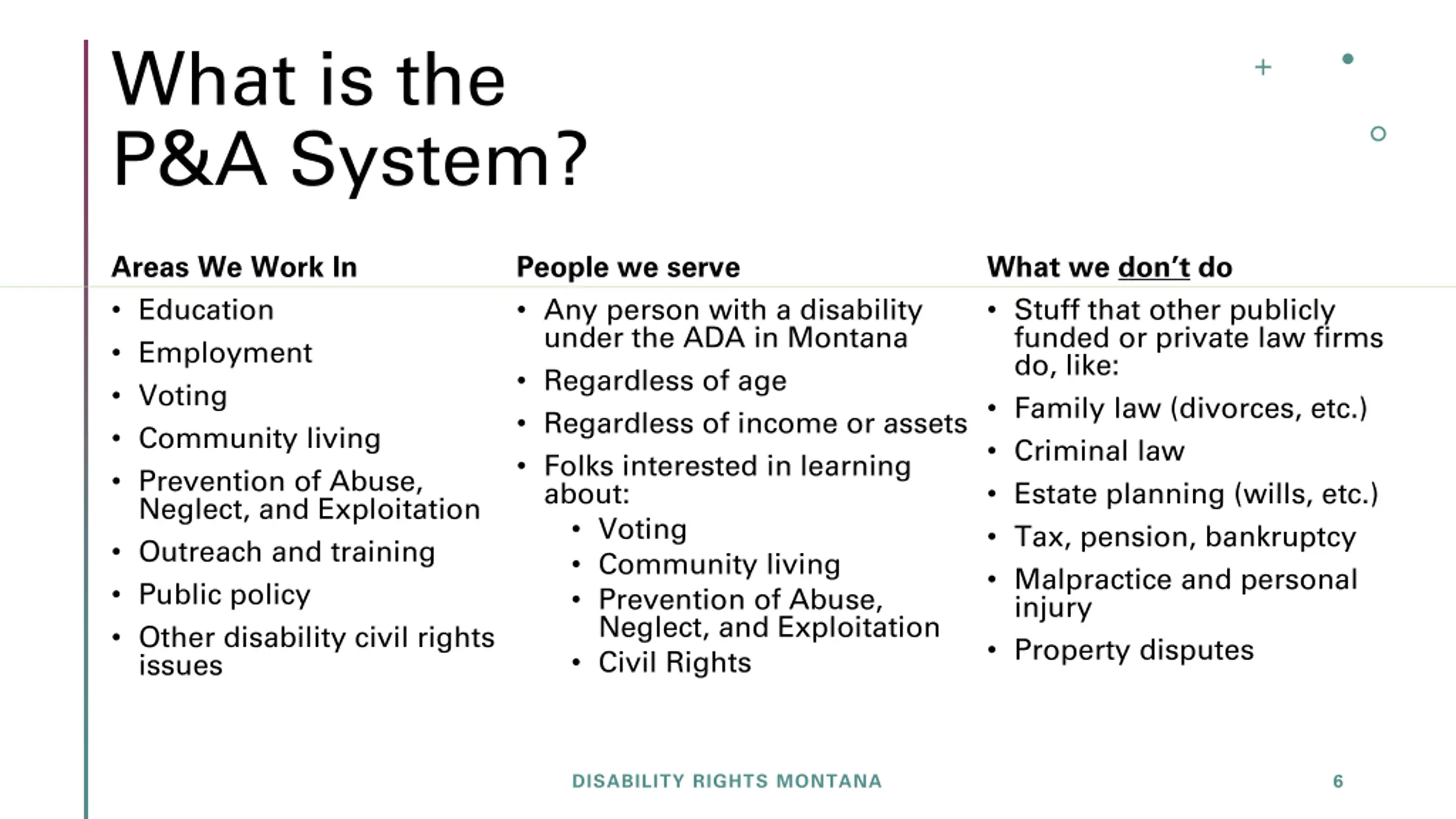What is the P&A System? Areas We Work In Education Employment Voting Community living Prevention of Abuse, Neglect, and Exploitation Outreach and training Public policy Other disability civil rights issues People we serve Any person with a disability under the ADA in Montana Regardless of age Regardless of income or assets Folks interested in learning about: Voting Community living Prevention of Abuse, Neglect, and Exploitation Civil Rights What we don t do Stuff that other publicly funded or private law firms do, like: Family law (divorces, etc.) Criminal law Estate planning (wills, etc.) Tax, pension, bankruptcy Malpractice and personal injury Property disputes DISABILITY RIGHTS MONTANA 6