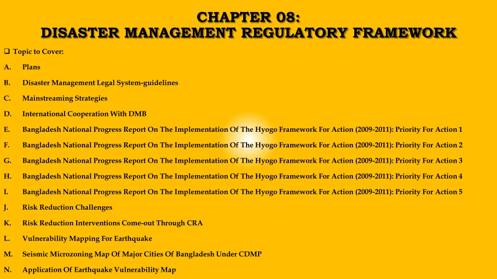 CHAPTER 08: DISASTER MANAGEMENT REGULATORY FRAMEWORK Topic to Cover: A. Plans B. Disaster Management Legal System-guidelines C. Mainstreaming Strategies D. International Cooperation With DMB E. Bangladesh National Progress Report On The Implementation Of The Hyogo Framework For Action (2009-2011): Priority For Action 1 F. Bangladesh National Progress Report On The Implementation Of The Hyogo Framework For Action (2009-2011): Priority For Action 2 G. Bangladesh National Progress Report On The Implementation Of The Hyogo Framework For Action (2009-2011): Priority For Action 3 H. Bangladesh National Progress Report On The Implementation Of The Hyogo Framework For Action (2009-2011): Priority For Action 4 I. Bangladesh National Progress Report On The Implementation Of The Hyogo Framework For Action (2009-2011): Priority For Action 5 J. Risk Reduction Challenges K. Risk Reduction Interventions Come-out Through CRA L. Vulnerability Mapping For Earthquake M. Seismic Microzoning Map Of Major Cities Of Bangladesh Under CDMP N. Application Of Earthquake Vulnerability Map