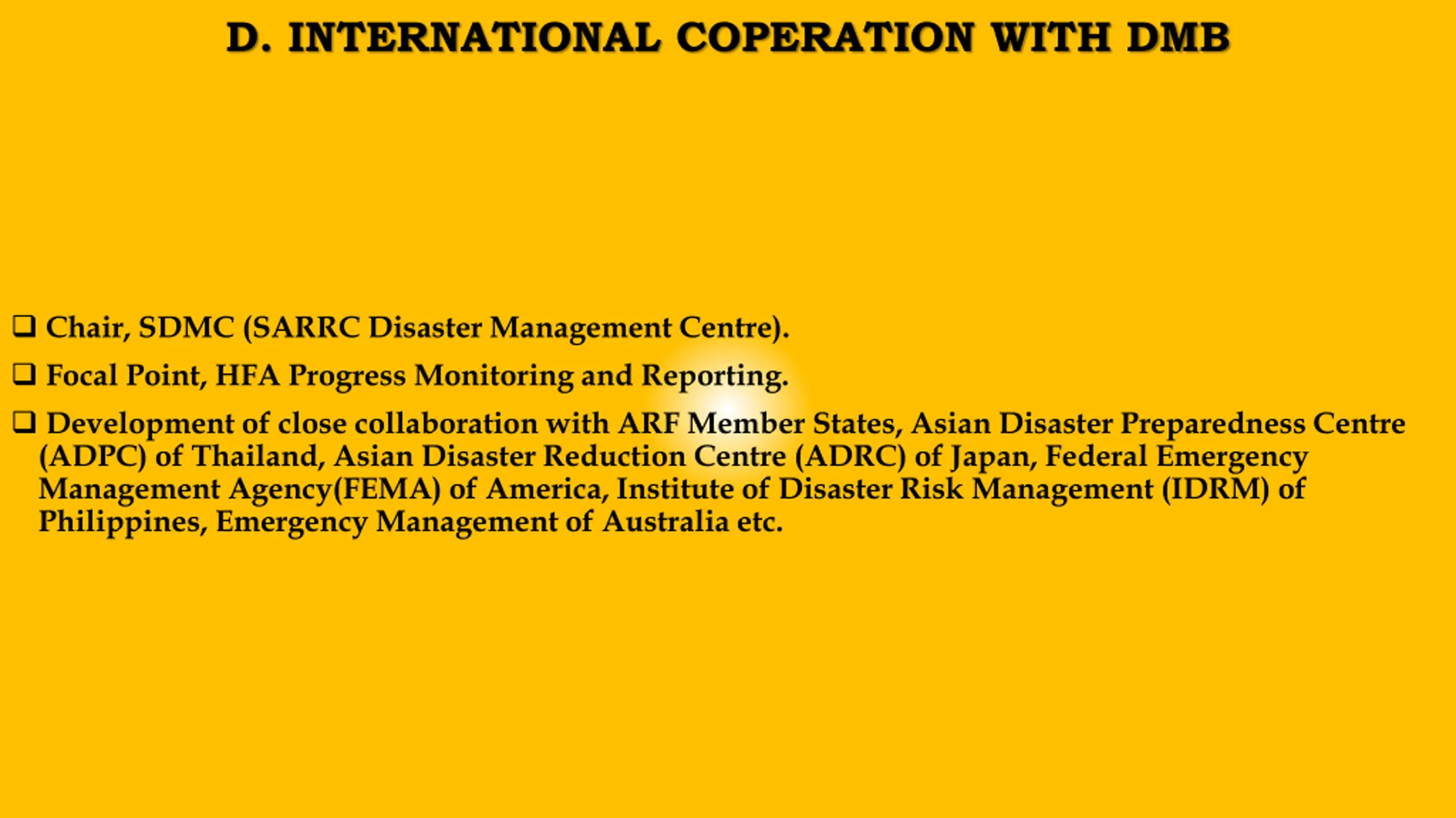 D. INTERNATIONAL COPERATION WITH DMB Chair, SDMC (SARRC Disaster Management Centre). Focal Point, HFA Progress Monitoring and Reporting. Development of close collaboration with ARF Member States, Asian Disaster Preparedness Centre (ADPC) of Thailand, Asian Disaster Reduction Centre (ADRC) of Japan, Federal Emergency Management Agency(FEMA) of America, Institute of Disaster Risk Management (IDRM) of Philippines, Emergency Management of Australia etc.