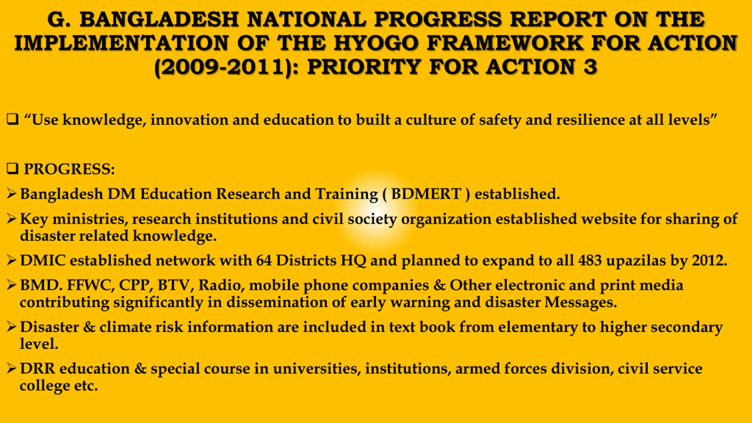 G. BANGLADESH NATIONAL PROGRESS REPORT ON THE IMPLEMENTATION OF THE HYOGO FRAMEWORK FOR ACTION (2009-2011): PRIORITY FOR ACTION 3 Use knowledge, innovation and education to built a culture of safety and resilience at all levels PROGRESS: Bangladesh DM Education Research and Training ( BDMERT ) established. Key ministries, research institutions and civil society organization established website for sharing of disaster related knowledge. DMIC established network with 64 Districts HQ and planned to expand to all 483 upazilas by 2012. BMD. FFWC, CPP, BTV, Radio, mobile phone companies & Other electronic and print media contributing significantly in dissemination of early warning and disaster Messages. Disaster & climate risk information are included in text book from elementary to higher secondary level. DRR education & special course in universities, institutions, armed forces division, civil service college etc.