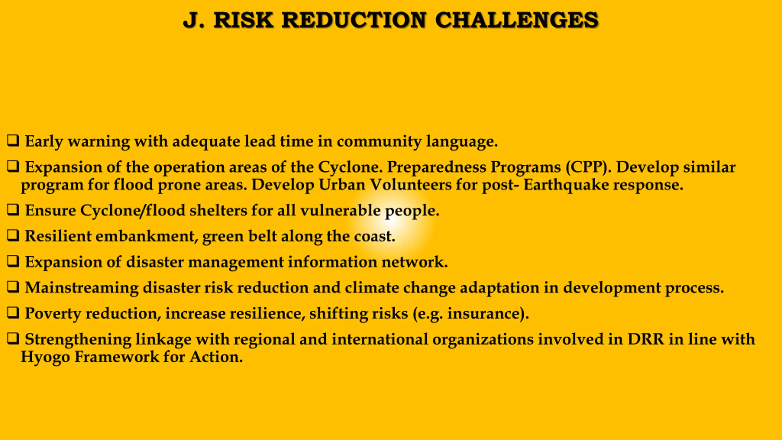 J. RISK REDUCTION CHALLENGES Early warning with adequate lead time in community language. Expansion of the operation areas of the Cyclone. Preparedness Programs (CPP). Develop similar program for flood prone areas. Develop Urban Volunteers for post- Earthquake response. Ensure Cyclone/flood shelters for all vulnerable people. Resilient embankment, green belt along the coast. Expansion of disaster management information network. Mainstreaming disaster risk reduction and climate change adaptation in development process. Poverty reduction, increase resilience, shifting risks (e.g. insurance). Strengthening linkage with regional and international organizations involved in DRR in line with Hyogo Framework for Action.