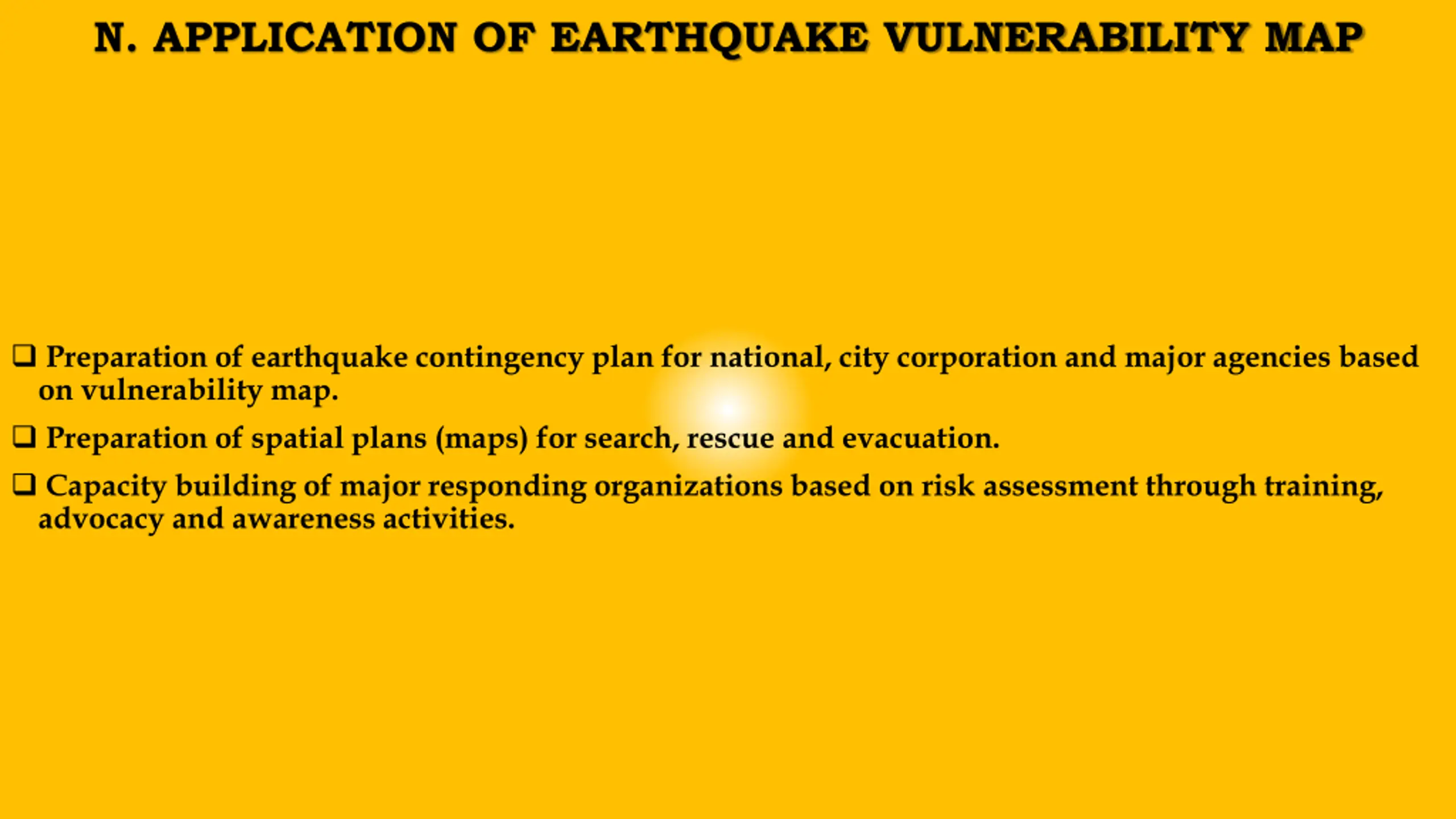 N. APPLICATION OF EARTHQUAKE VULNERABILITY MAP Preparation of earthquake contingency plan for national, city corporation and major agencies based on vulnerability map. Preparation of spatial plans (maps) for search, rescue and evacuation. Capacity building of major responding organizations based on risk assessment through training, advocacy and awareness activities.