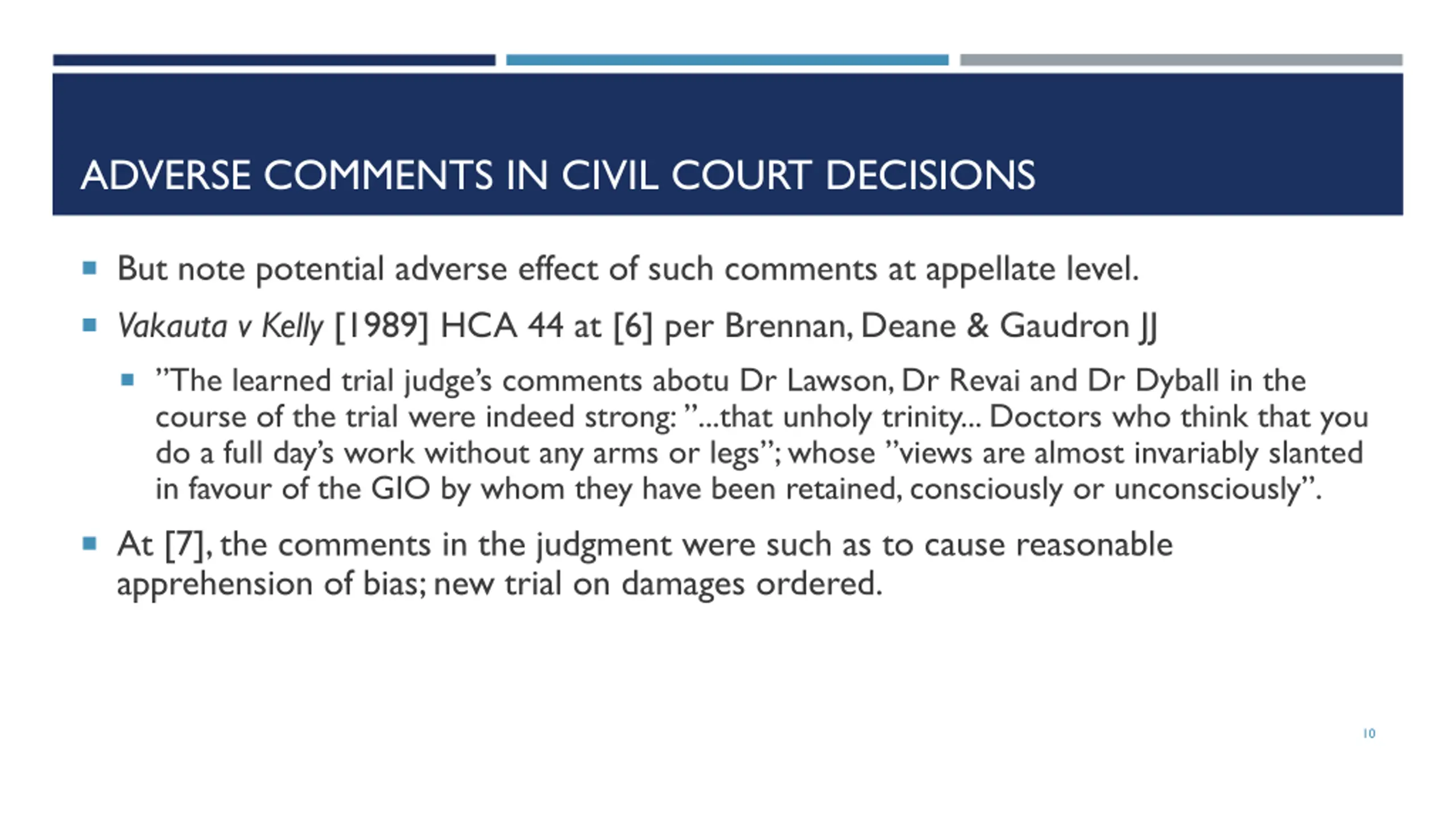 ADVERSE COMMENTS IN CIVIL COURT DECISIONS But note potential adverse effect of such comments at appellate level. Vakauta v Kelly [1989] HCA 44 at [6] per Brennan, Deane & Gaudron JJ The learned trial judge s comments abotu Dr Lawson, Dr Revai and Dr Dyball in the course of the trial were indeed strong: ...that unholy trinity... Doctors who think that you do a full day s work without any arms or legs ; whose views are almost invariably slanted in favour of the GIO by whom they have been retained, consciously or unconsciously . At [7], the comments in the judgment were such as to cause reasonable apprehension of bias; new trial on damages ordered. 10