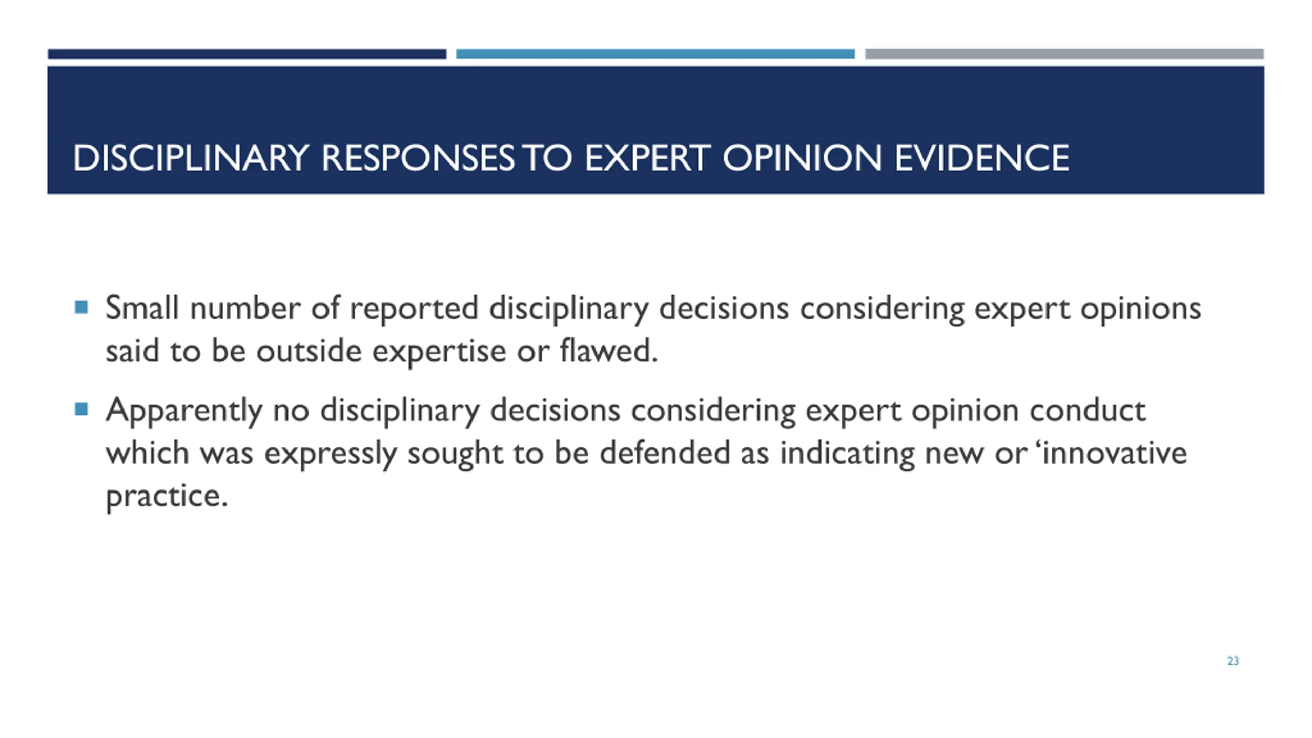 DISCIPLINARY RESPONSES TO EXPERT OPINION EVIDENCE Small number of reported disciplinary decisions considering expert opinions said to be outside expertise or flawed. Apparently no disciplinary decisions considering expert opinion conduct which was expressly sought to be defended as indicating new or innovative practice. 23