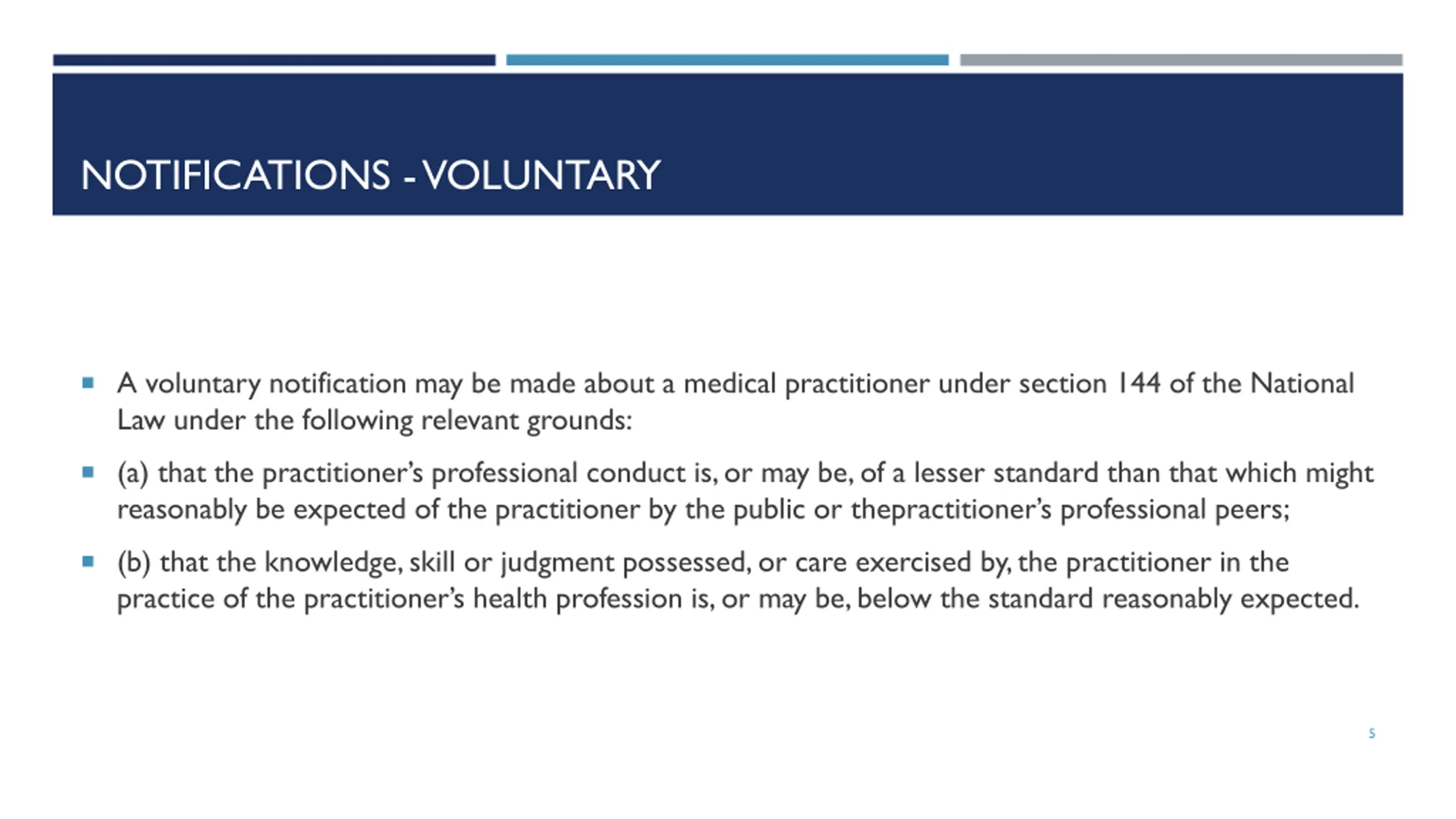 NOTIFICATIONS - VOLUNTARY A voluntary notification may be made about a medical practitioner under section 144 of the National Law under the following relevant grounds: (a) that the practitioner s professional conduct is, or may be, of a lesser standard than that which might reasonably be expected of the practitioner by the public or thepractitioner s professional peers; (b) that the knowledge, skill or judgment possessed, or care exercised by, the practitioner in the practice of the practitioner s health profession is, or may be, below the standard reasonably expected. 5