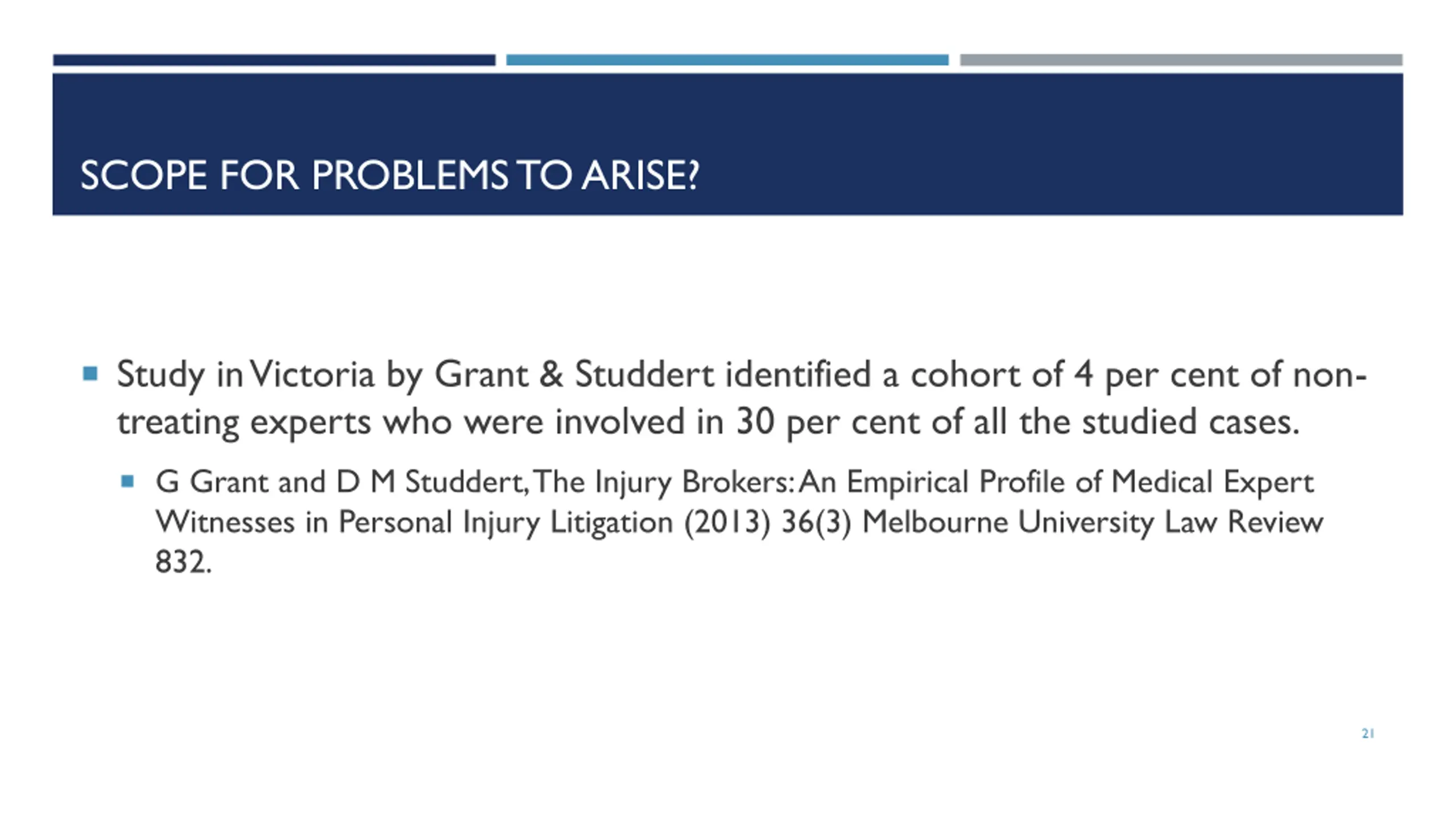 SCOPE FOR PROBLEMS TO ARISE? Study in Victoria by Grant & Studdert identified a cohort of 4 per cent of non- treating experts who were involved in 30 per cent of all the studied cases. G Grant and D M Studdert, The Injury Brokers: An Empirical Profile of Medical Expert Witnesses in Personal Injury Litigation (2013) 36(3) Melbourne University Law Review 832. 21