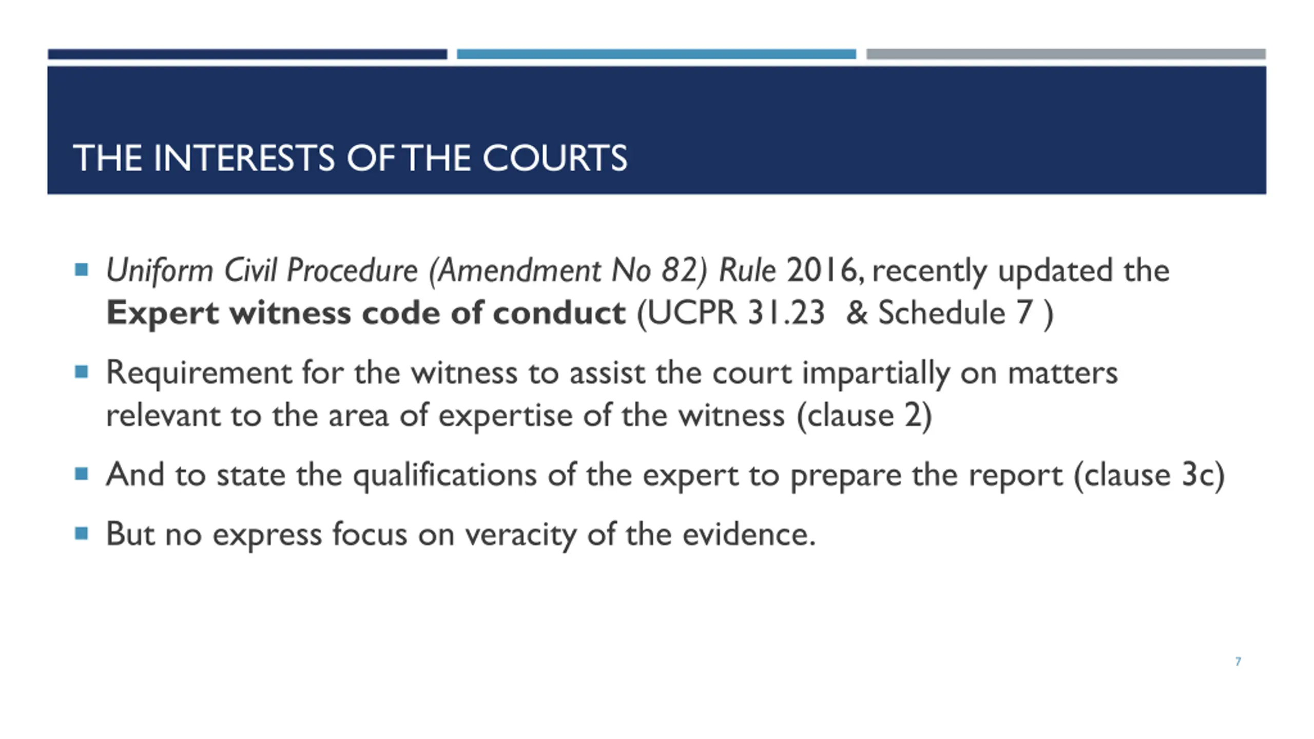THE INTERESTS OF THE COURTS Uniform Civil Procedure (Amendment No 82) Rule 2016, recently updated the Expert witness code of conduct (UCPR 31.23 & Schedule 7 ) Requirement for the witness to assist the court impartially on matters relevant to the area of expertise of the witness (clause 2) And to state the qualifications of the expert to prepare the report (clause 3c) But no express focus on veracity of the evidence. 7
