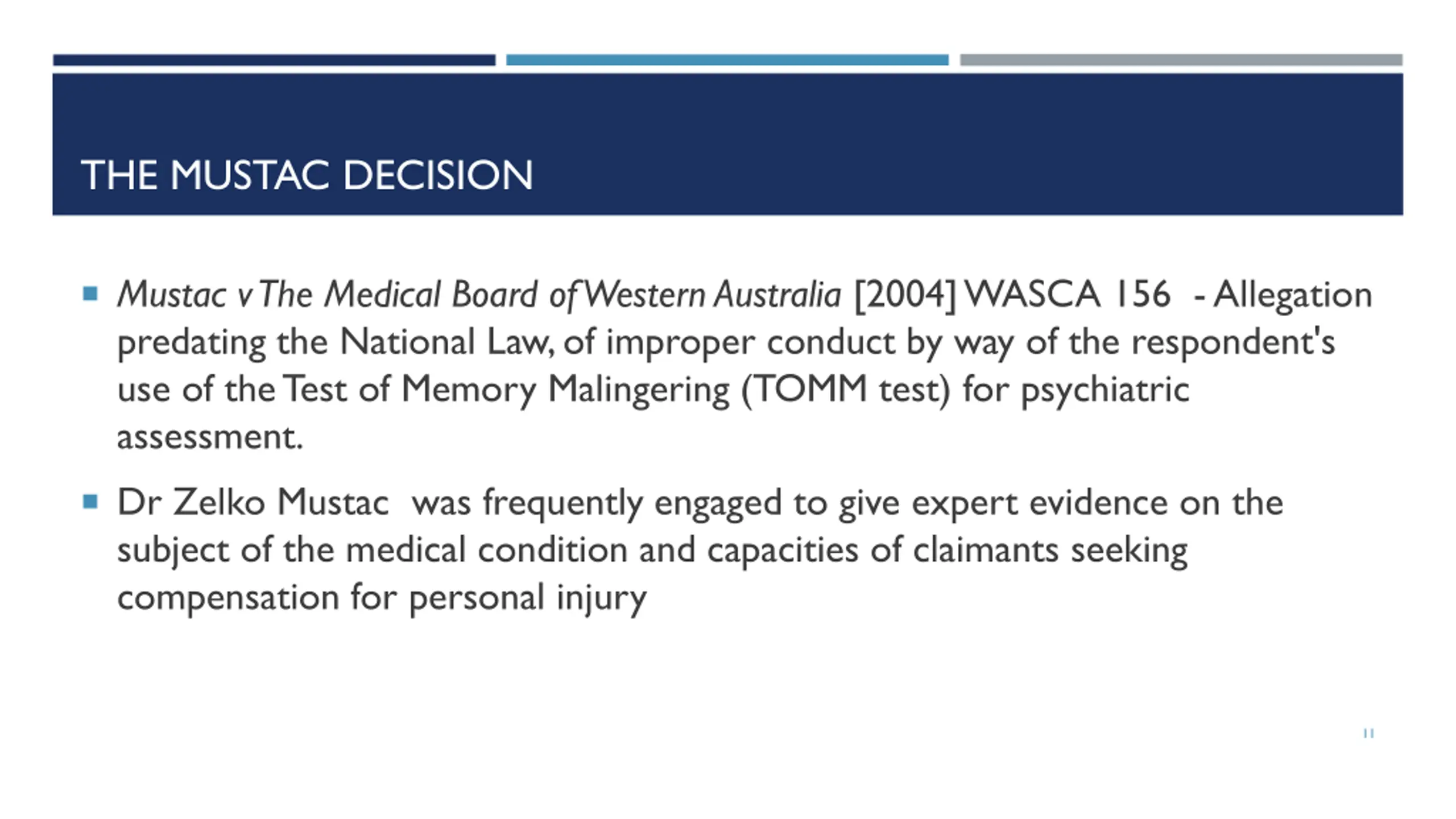 THE MUSTAC DECISION Mustac v The Medical Board of Western Australia [2004] WASCA 156 - Allegation predating the National Law, of improper conduct by way of the respondent's use of the Test of Memory Malingering (TOMM test) for psychiatric assessment. Dr Zelko Mustac was frequently engaged to give expert evidence on the subject of the medical condition and capacities of claimants seeking compensation for personal injury 11