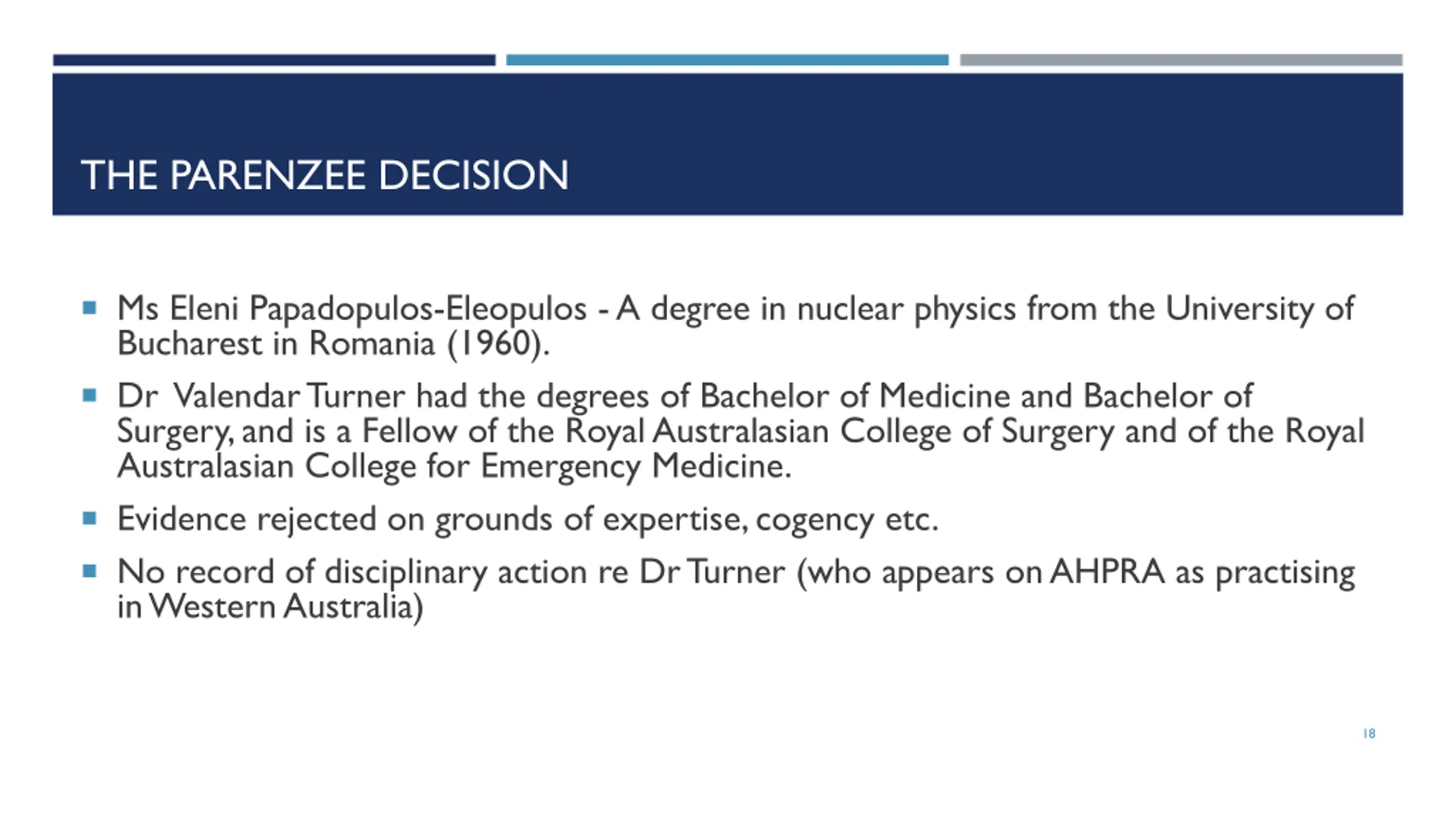 THE PARENZEE DECISION Ms Eleni Papadopulos-Eleopulos - A degree in nuclear physics from the University of Bucharest in Romania (1960). Dr Valendar Turner had the degrees of Bachelor of Medicine and Bachelor of Surgery, and is a Fellow of the Royal Australasian College of Surgery and of the Royal Australasian College for Emergency Medicine. Evidence rejected on grounds of expertise, cogency etc. No record of disciplinary action re Dr Turner (who appears on AHPRA as practising in Western Australia) 18