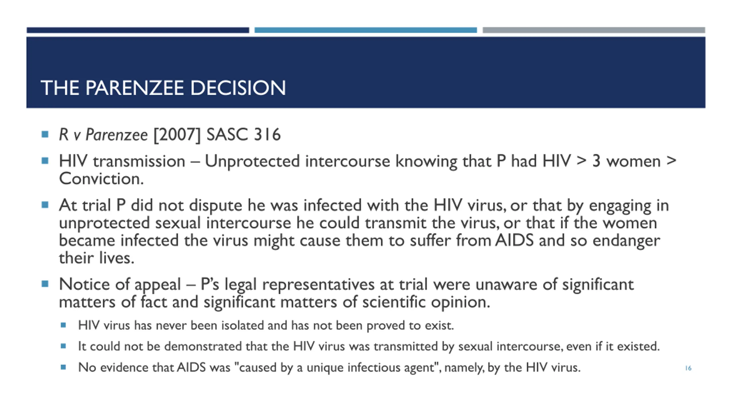 THE PARENZEE DECISION R v Parenzee [2007] SASC 316 HIV transmission Unprotected intercourse knowing that P had HIV > 3 women > Conviction. At trial P did not dispute he was infected with the HIV virus, or that by engaging in unprotected sexual intercourse he could transmit the virus, or that if the women became infected the virus might cause them to suffer from AIDS and so endanger their lives. Notice of appeal P s legal representatives at trial were unaware of significant matters of fact and significant matters of scientific opinion. HIV virus has never been isolated and has not been proved to exist. It could not be demonstrated that the HIV virus was transmitted by sexual intercourse, even if it existed. No evidence that AIDS was "caused by a unique infectious agent", namely, by the HIV virus. 16