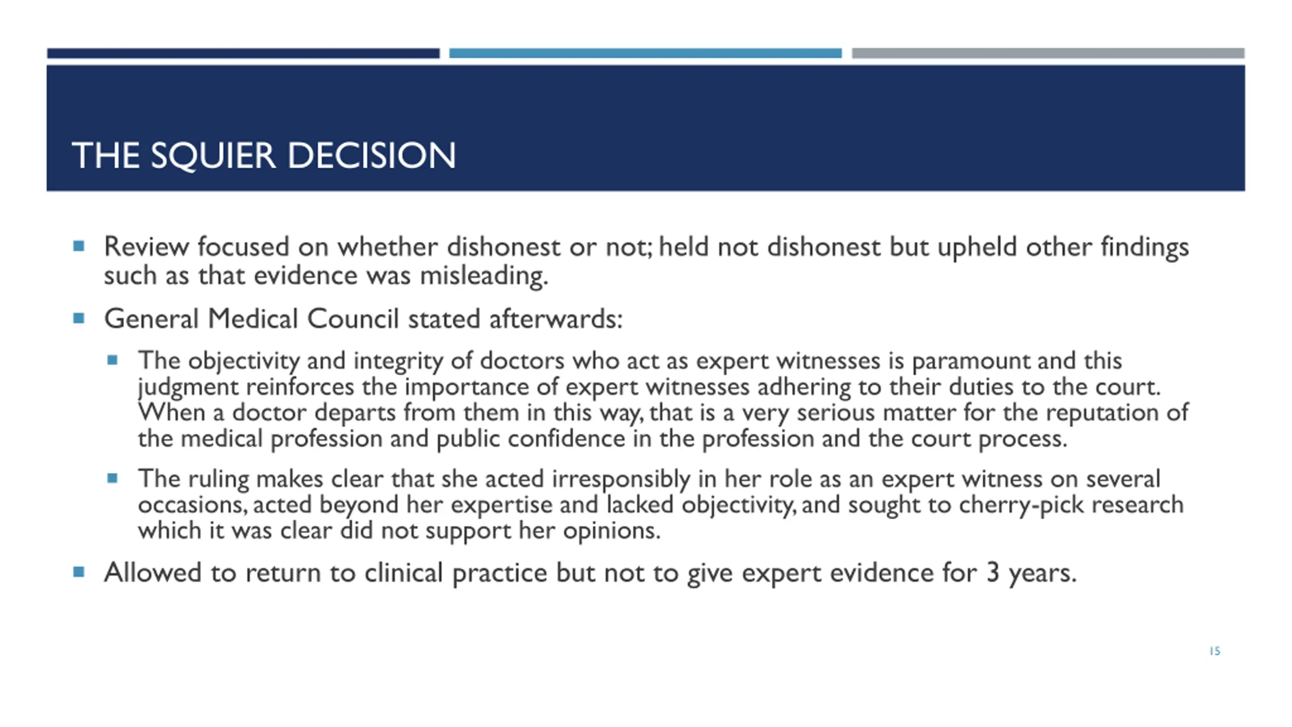THE SQUIER DECISION Review focused on whether dishonest or not; held not dishonest but upheld other findings such as that evidence was misleading. General Medical Council stated afterwards: The objectivity and integrity of doctors who act as expert witnesses is paramount and this judgment reinforces the importance of expert witnesses adhering to their duties to the court. When a doctor departs from them in this way, that is a very serious matter for the reputation of the medical profession and public confidence in the profession and the court process. The ruling makes clear that she acted irresponsibly in her role as an expert witness on several occasions, acted beyond her expertise and lacked objectivity, and sought to cherry-pick research which it was clear did not support her opinions. Allowed to return to clinical practice but not to give expert evidence for 3 years. 15
