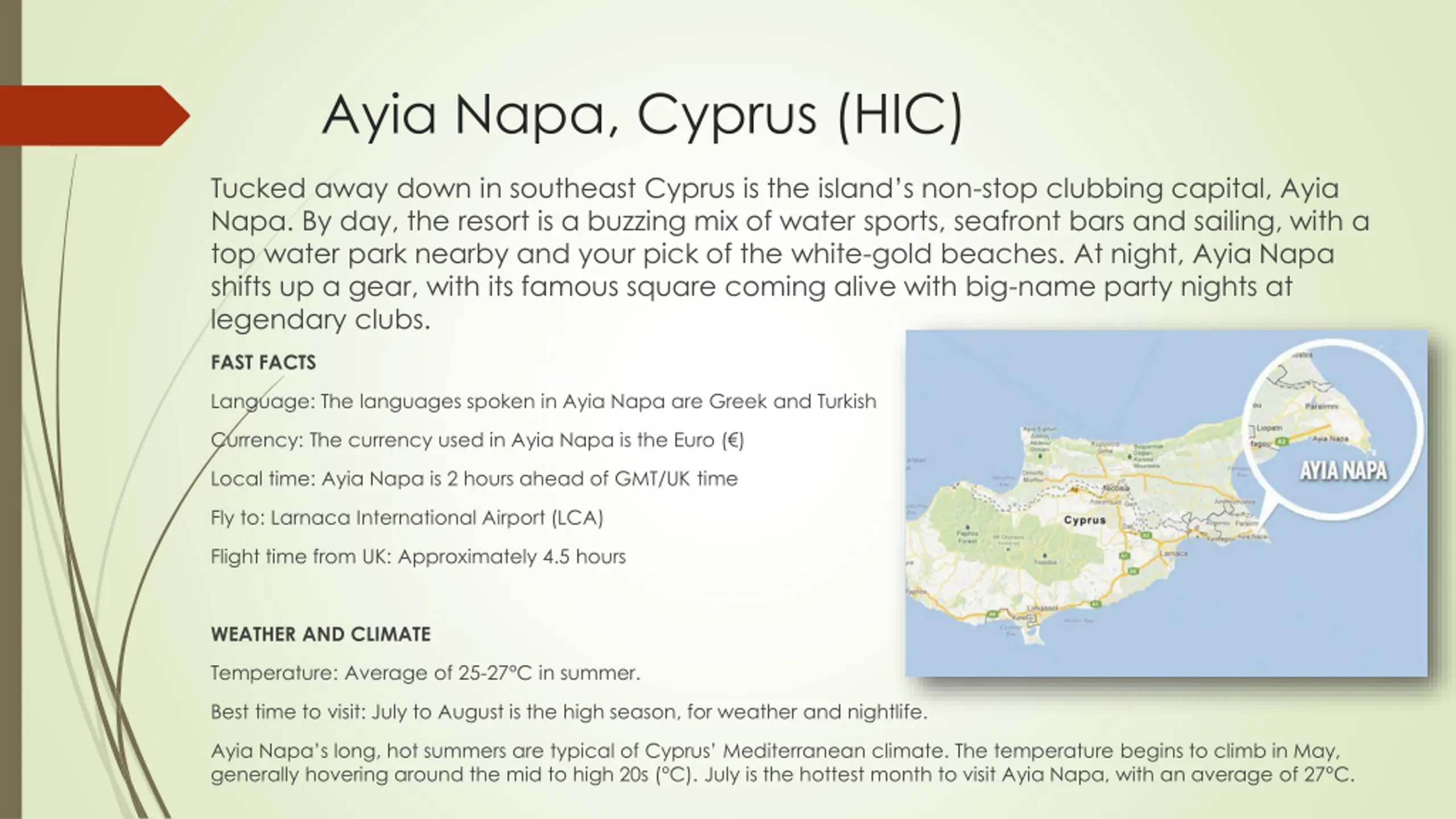 Ayia Napa, Cyprus (HIC) Tucked away down in southeast Cyprus is the island s non-stop clubbing capital, Ayia Napa. By day, the resort is a buzzing mix of water sports, seafront bars and sailing, with a top water park nearby and your pick of the white-gold beaches. At night, Ayia Napa shifts up a gear, with its famous square coming alive with big-name party nights at legendary clubs. FAST FACTS Language: The languages spoken in Ayia Napa are Greek and Turkish Currency: The currency used in Ayia Napa is the Euro ( ) Local time: Ayia Napa is 2 hours ahead of GMT/UK time Fly to: Larnaca International Airport (LCA) Flight time from UK: Approximately 4.5 hours WEATHER AND CLIMATE Temperature: Average of 25-27 C in summer. Best time to visit: July to August is the high season, for weather and nightlife. Ayia Napa s long, hot summers are typical of Cyprus Mediterranean climate. The temperature begins to climb in May, generally hovering around the mid to high 20s ( C). July is the hottest month to visit Ayia Napa, with an average of 27 C.