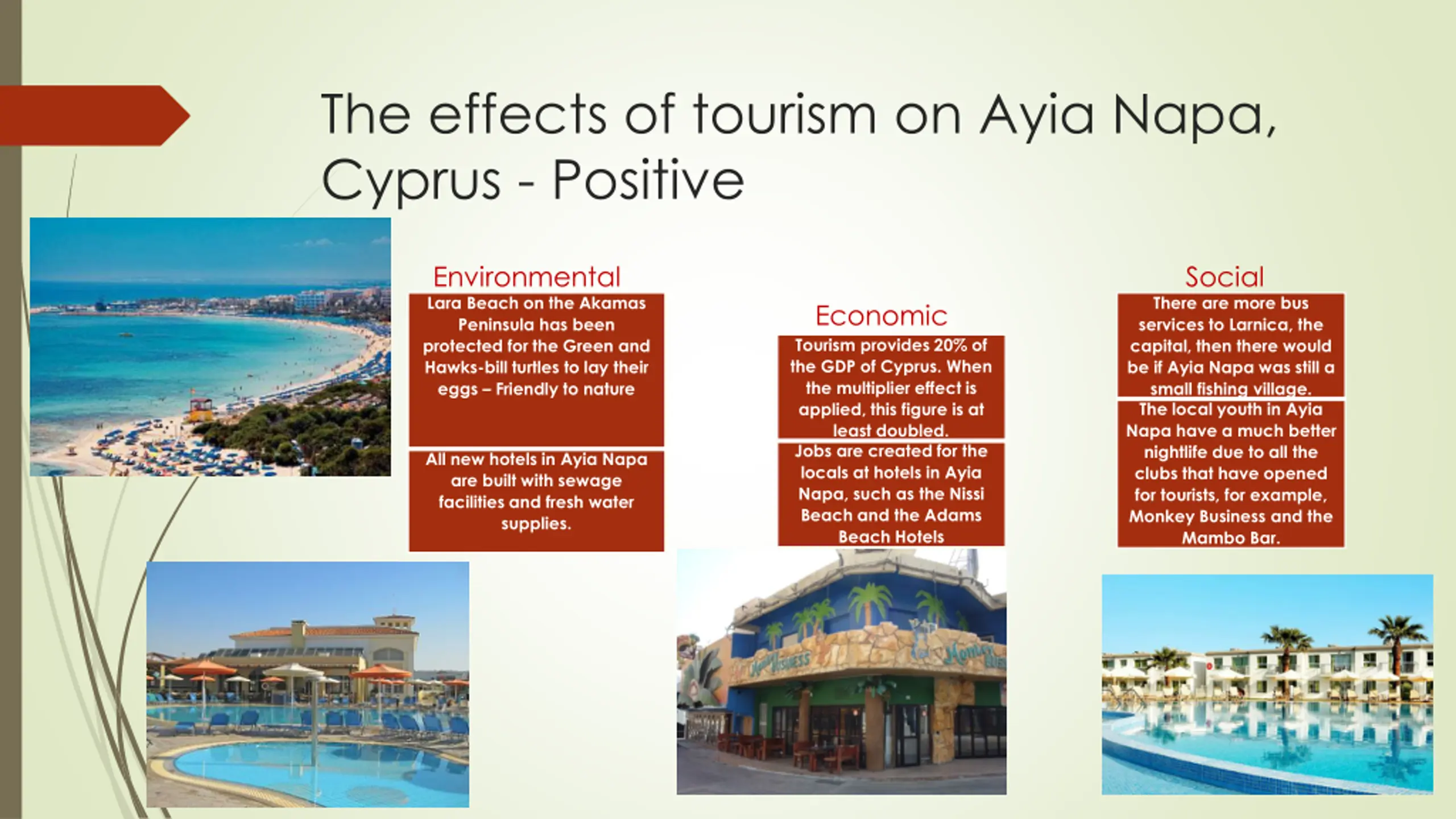 The effects of tourism on Ayia Napa, Cyprus - Positive http://www.xmltravel.com/content/resort/myt/aiya-napa10 Environmental Lara Beach on the Akamas Peninsula has been protected for the Green and Hawks-bill turtles to lay their eggs Friendly to nature Social There are more bus services to Larnica, the capital, then there would be if Ayia Napa was still a small fishing village. The local youth in Ayia Napa have a much better nightlife due to all the clubs that have opened for tourists, for example, Monkey Business and the Mambo Bar. Economic Tourism provides 20% of the GDP of Cyprus. When the multiplier effect is applied, this figure is at least doubled. Jobs are created for the locals at hotels in Ayia Napa, such as the Nissi Beach and the Adams Beach Hotels All new hotels in Ayia Napa are built with sewage facilities and fresh water supplies.
