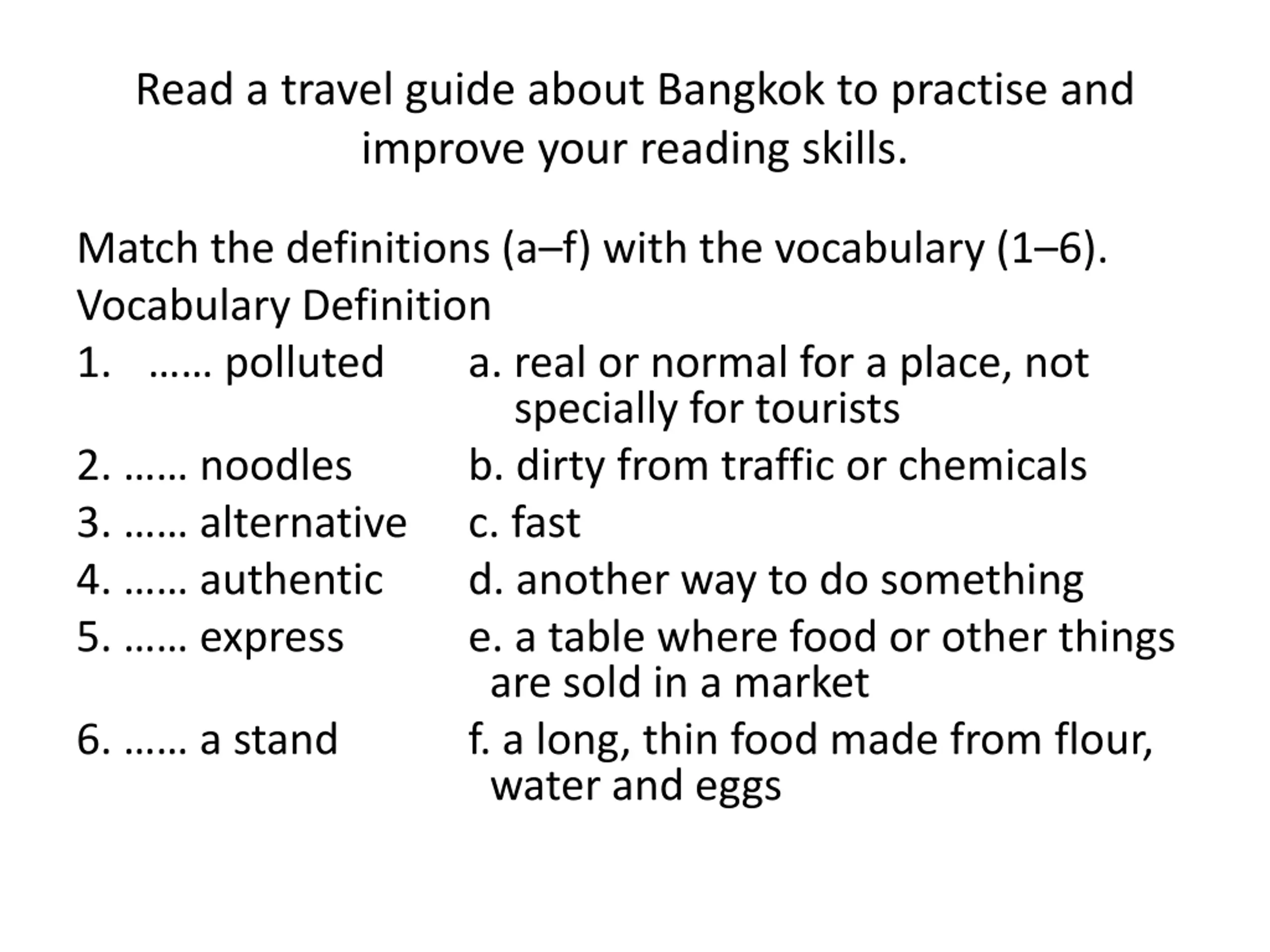 Read a travel guide about Bangkok to practise and improve your reading skills. Match the definitions (a f) with the vocabulary (1 6). Vocabulary Definition 1. polluted a. real or normal for a place, not specially for tourists 2. noodles b. dirty from traffic or chemicals 3. alternative c. fast 4. authentic d. another way to do something 5. express e. a table where food or other things are sold in a market 6. a stand f. a long, thin food made from flour, water and eggs