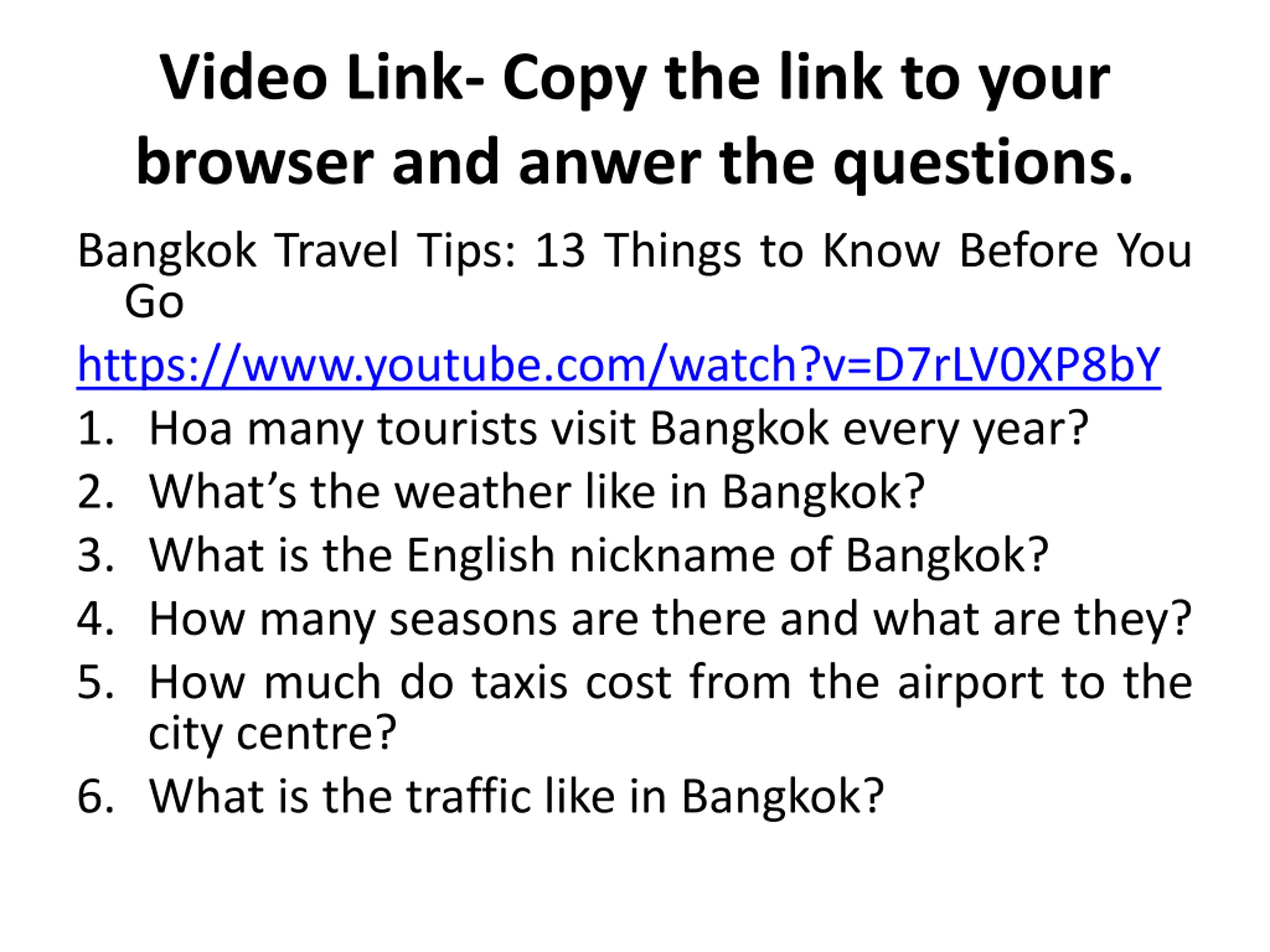 Video Link- Copy the link to your browser and anwer the questions. Bangkok Travel Tips: 13 Things to Know Before You Go https://www.youtube.com/watch?v=D7rLV0XP8bY 1. Hoa many tourists visit Bangkok every year? 2. What s the weather like in Bangkok? 3. What is the English nickname of Bangkok? 4. How many seasons are there and what are they? 5. How much do taxis cost from the airport to the city centre? 6. What is the traffic like in Bangkok?
