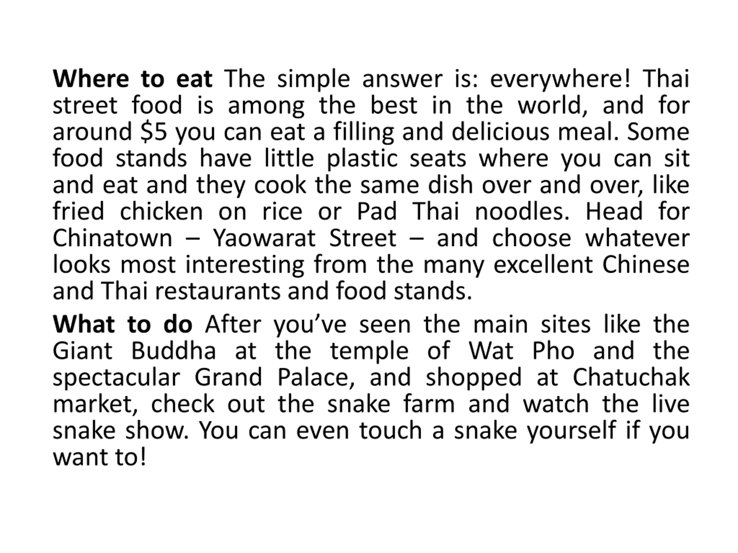 Where to eat The simple answer is: everywhere! Thai street food is among the best in the world, and for around $5 you can eat a filling and delicious meal. Some food stands have little plastic seats where you can sit and eat and they cook the same dish over and over, like fried chicken on rice or Pad Thai noodles. Head for Chinatown Yaowarat Street and choose whatever looks most interesting from the many excellent Chinese and Thai restaurants and food stands. What to do After you ve seen the main sites like the Giant Buddha at the temple of Wat Pho and the spectacular Grand Palace, and shopped at Chatuchak market, check out the snake farm and watch the live snake show. You can even touch a snake yourself if you want to!