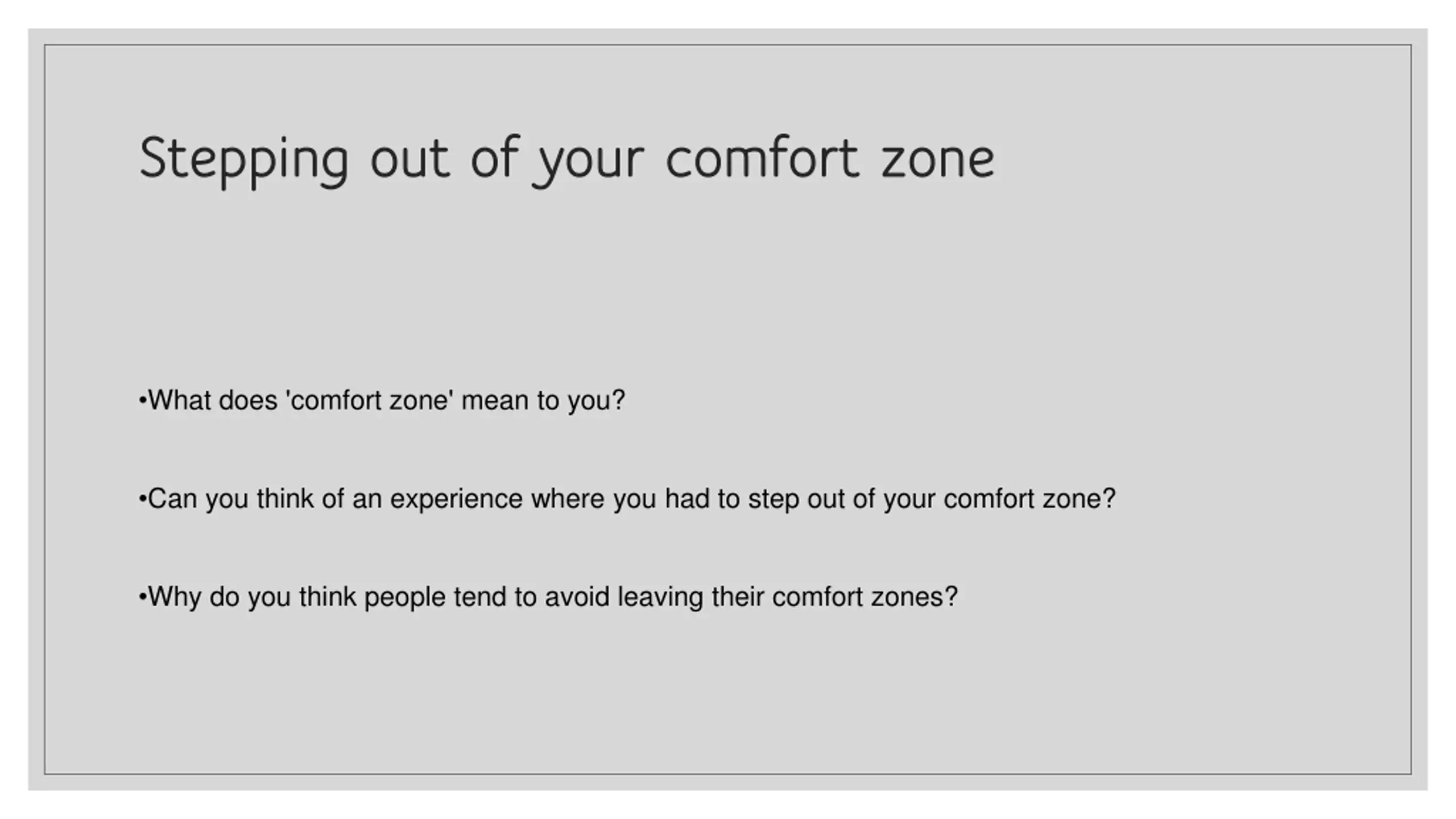 Stepping out of your comfort zone Stepping out of your comfort zone What does 'comfort zone' mean to you? Can you think of an experience where you had to step out of your comfort zone? Why do you think people tend to avoid leaving their comfort zones?