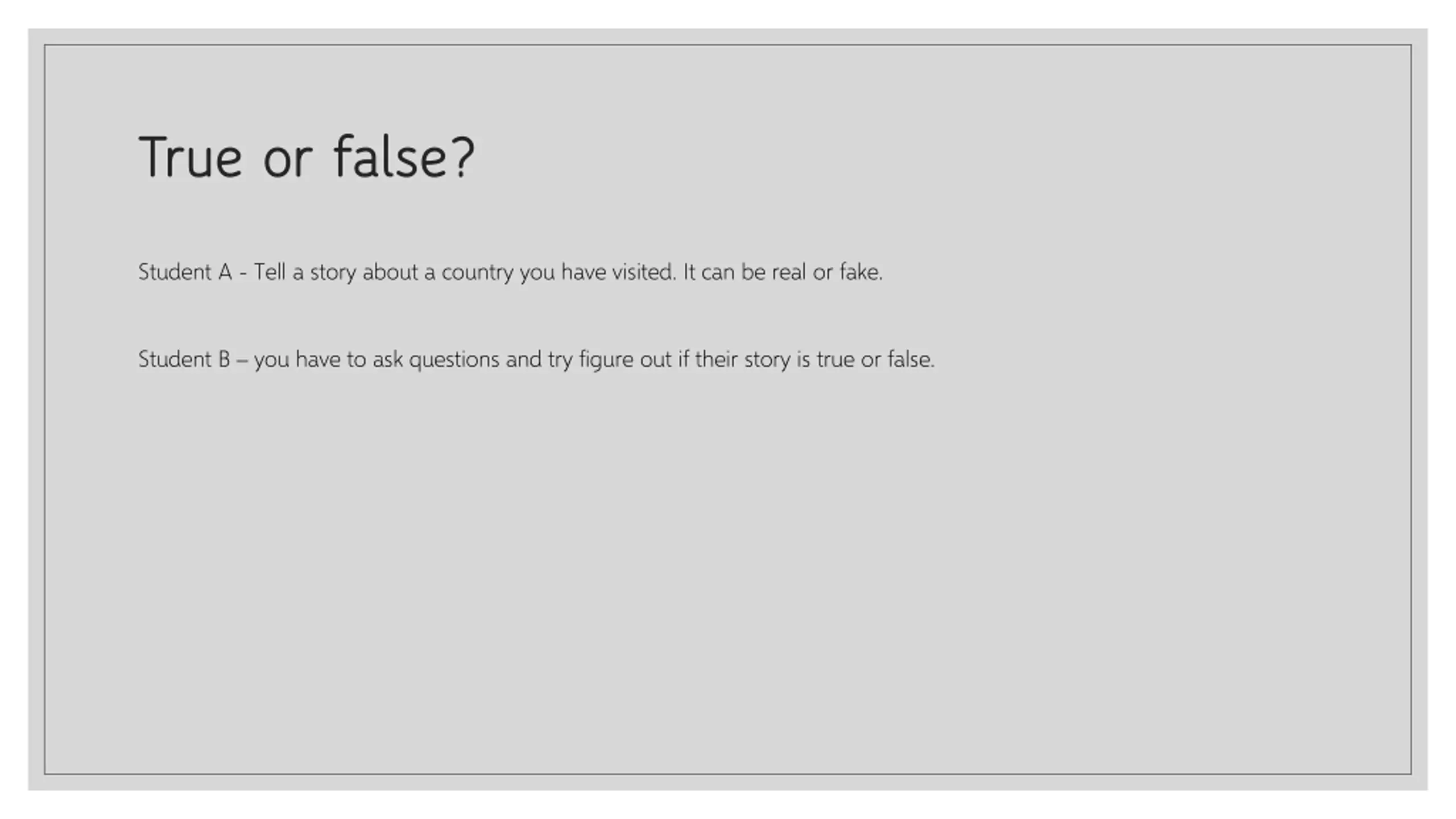 True or false? True or false? Student A - Tell a story about a country you have visited. It can be real or fake. Student B you have to ask questions and try figure out if their story is true or false.