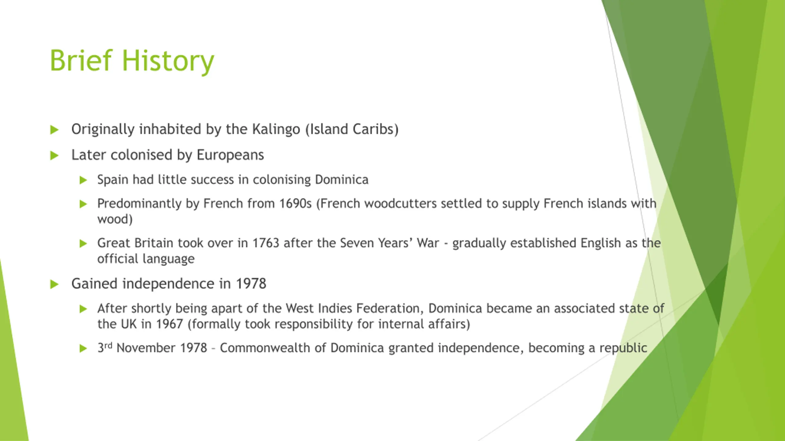Brief History Originally inhabited by the Kalingo (Island Caribs) Later colonised by Europeans Spain had little success in colonising Dominica Predominantly by French from 1690s (French woodcutters settled to supply French islands with wood) Great Britain took over in 1763 after the Seven Years War - gradually established English as the official language Gained independence in 1978 After shortly being apart of the West Indies Federation, Dominica became an associated state of the UK in 1967 (formally took responsibility for internal affairs) 3rdNovember 1978 Commonwealth of Dominica granted independence, becoming a republic