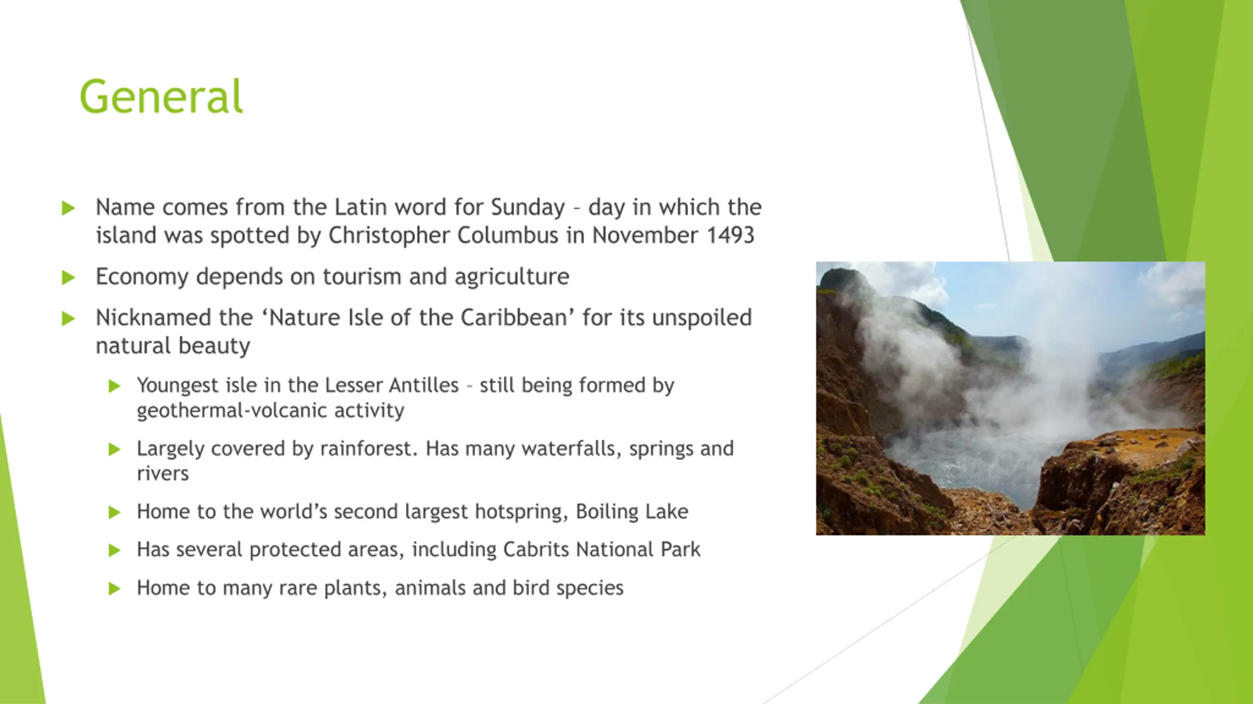 General Name comes from the Latin word for Sunday day in which the island was spotted by Christopher Columbus in November 1493 Economy depends on tourism and agriculture Nicknamed the Nature Isle of the Caribbean for its unspoiled natural beauty Youngest isle in the Lesser Antilles still being formed by geothermal-volcanic activity Largely covered by rainforest. Has many waterfalls, springs and rivers Home to the world s second largest hotspring, Boiling Lake Has several protected areas, including Cabrits National Park Home to many rare plants, animals and bird species