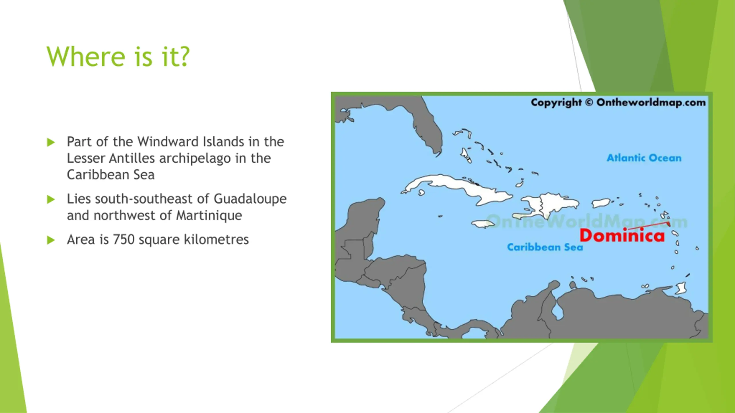 Where is it? Part of the Windward Islands in the Lesser Antilles archipelago in the Caribbean Sea Lies south-southeast of Guadaloupe and northwest of Martinique Area is 750 square kilometres