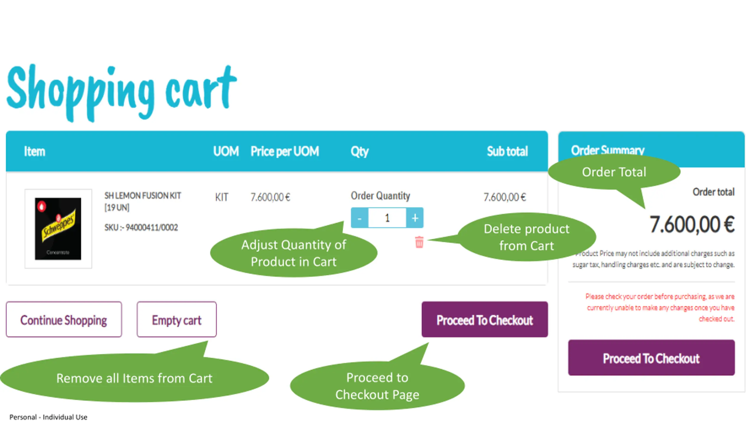 Order Total Delete product from Cart Adjust Quantity of Product in Cart Proceed to Checkout Page Remove all Items from Cart Personal - Individual Use