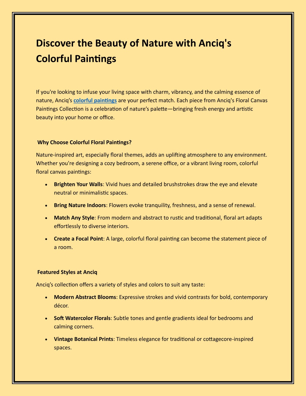 Discover the Beauty of Nature with Anciq's Colorful Paintings If you're looking to infuse your living space with charm, vibrancy, and the calming essence of nature, Anciq s colorful paintings are your perfect match. Each piece from Anciq's Floral Canvas Paintings Collection is a celebration of nature s palette bringing fresh energy and artistic beauty into your home or office. Why Choose Colorful Floral Paintings? Nature-inspired art, especially floral themes, adds an uplifting atmosphere to any environment. Whether you're designing a cozy bedroom, a serene office, or a vibrant living room, colorful floral canvas paintings: Brighten Your Walls: Vivid hues and detailed brushstrokes draw the eye and elevate neutral or minimalistic spaces. Bring Nature Indoors: Flowers evoke tranquility, freshness, and a sense of renewal. Match Any Style: From modern and abstract to rustic and traditional, floral art adapts effortlessly to diverse interiors. Create a Focal Point: A large, colorful floral painting can become the statement piece of a room. Featured Styles at Anciq Anciq s collection offers a variety of styles and colors to suit any taste: Modern Abstract Blooms: Expressive strokes and vivid contrasts for bold, contemporary d cor. Soft Watercolor Florals: Subtle tones and gentle gradients ideal for bedrooms and calming corners. Vintage Botanical Prints: Timeless elegance for traditional or cottagecore-inspired spaces.