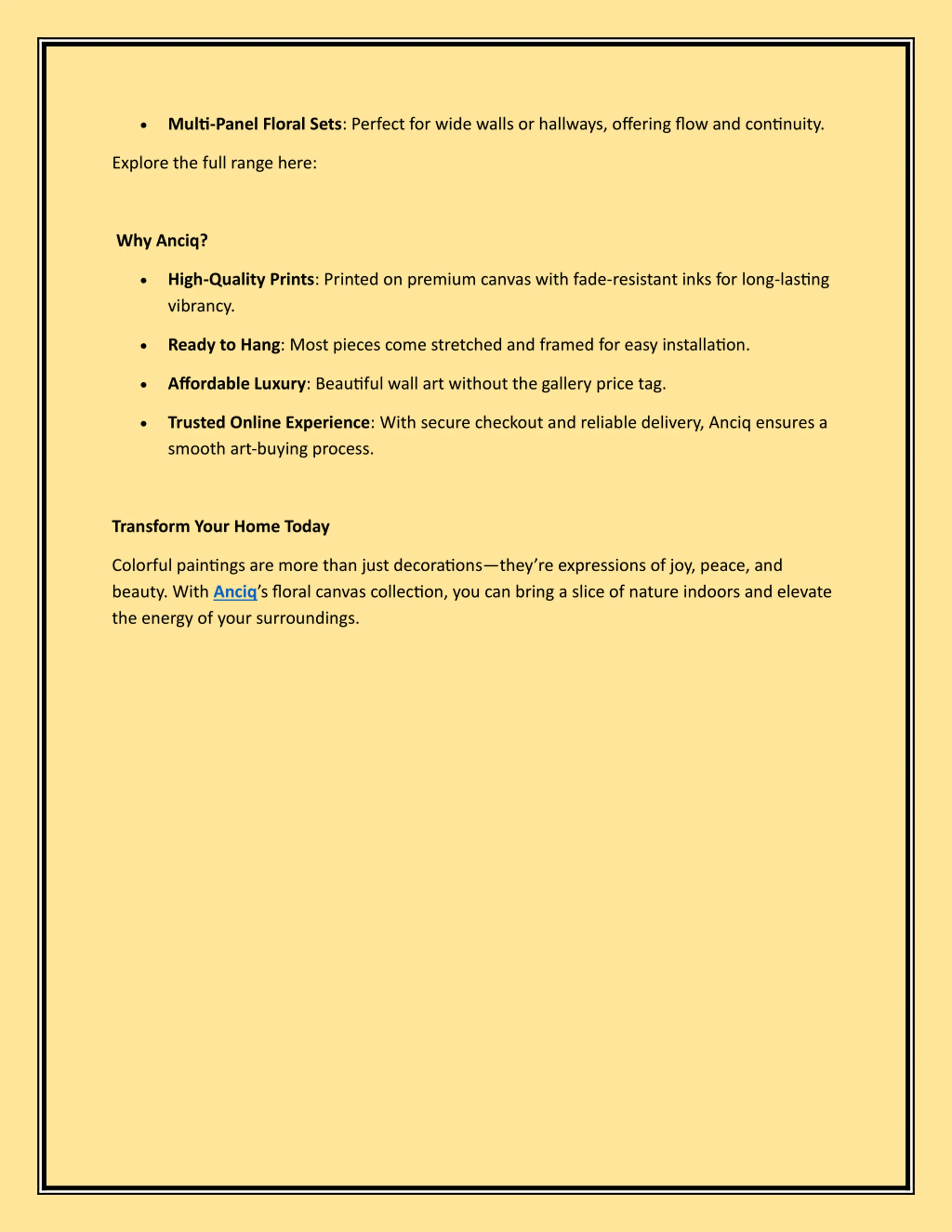 Multi-Panel Floral Sets: Perfect for wide walls or hallways, offering flow and continuity. Explore the full range here: Why Anciq? High-Quality Prints: Printed on premium canvas with fade-resistant inks for long-lasting vibrancy. Ready to Hang: Most pieces come stretched and framed for easy installation. Affordable Luxury: Beautiful wall art without the gallery price tag. Trusted Online Experience: With secure checkout and reliable delivery, Anciq ensures a smooth art-buying process. Transform Your Home Today Colorful paintings are more than just decorations they re expressions of joy, peace, and beauty. With Anciq s floral canvas collection, you can bring a slice of nature indoors and elevate the energy of your surroundings.