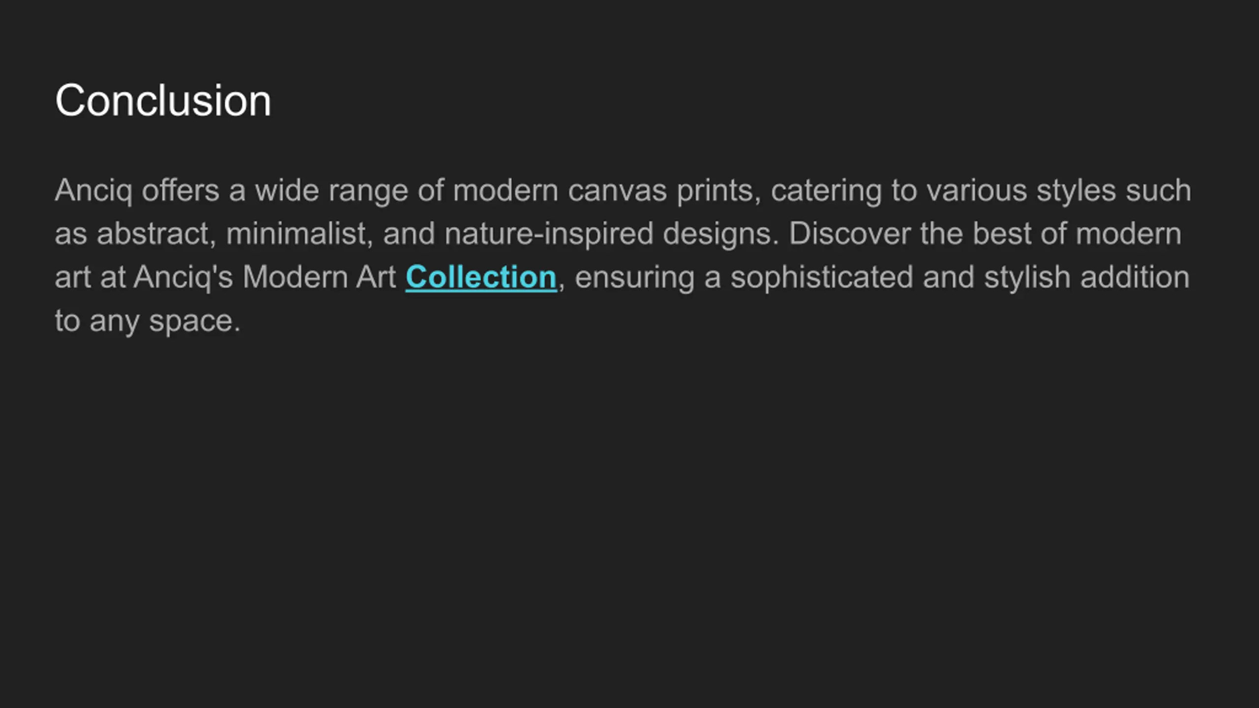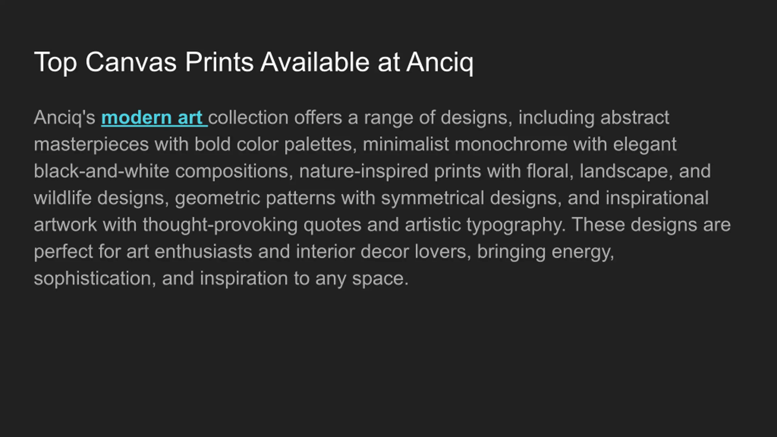 Conclusion Anciq offers a wide range of modern canvas prints, catering to various styles such as abstract, minimalist, and nature-inspired designs. Discover the best of modern art at Anciq's Modern Art Collection, ensuring a sophisticated and stylish addition to any space.