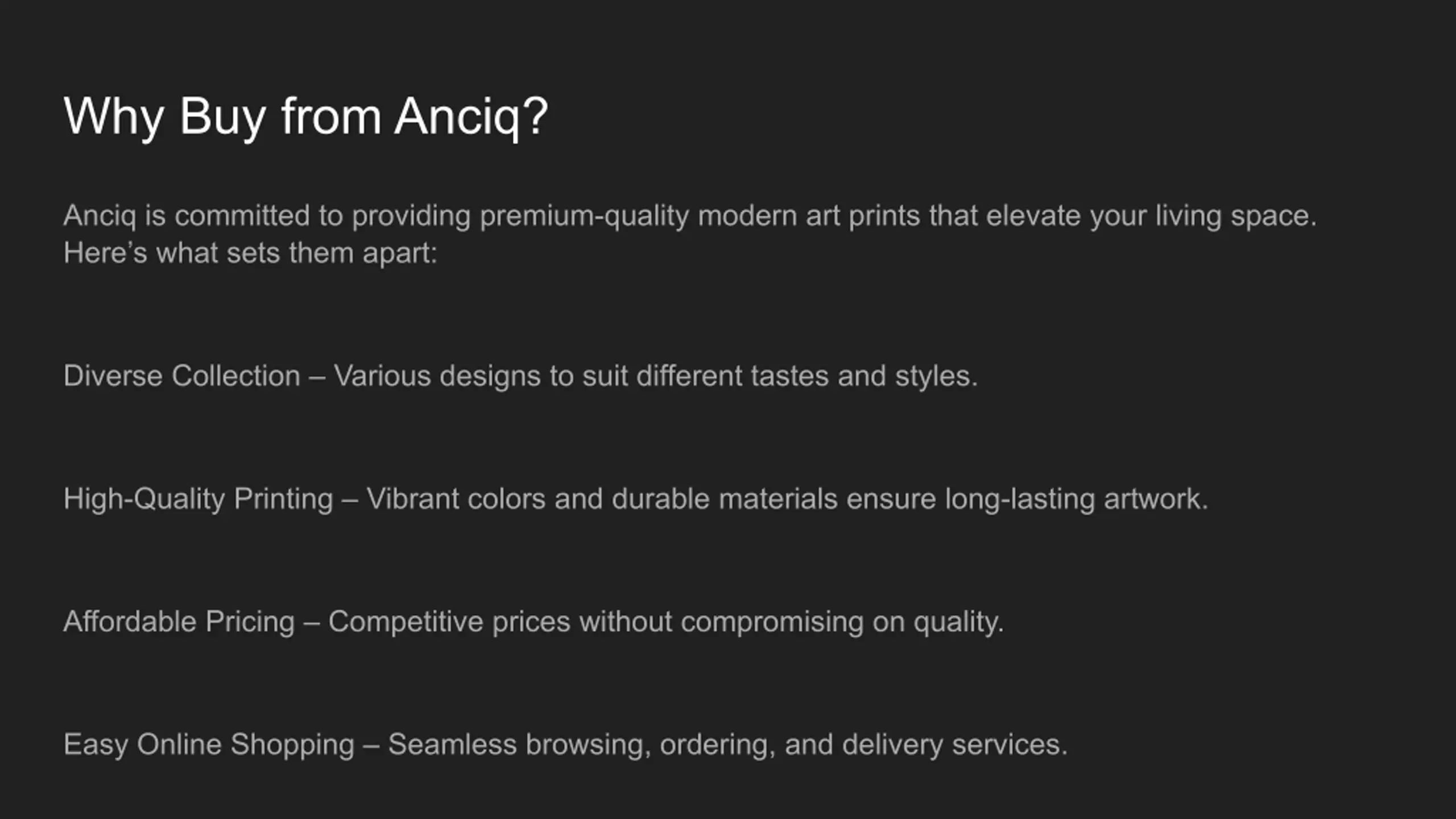 Why Buy from Anciq? Anciq is committed to providing premium-quality modern art prints that elevate your living space. Here s what sets them apart: Diverse Collection Various designs to suit different tastes and styles. High-Quality Printing Vibrant colors and durable materials ensure long-lasting artwork. Affordable Pricing Competitive prices without compromising on quality. Easy Online Shopping Seamless browsing, ordering, and delivery services.