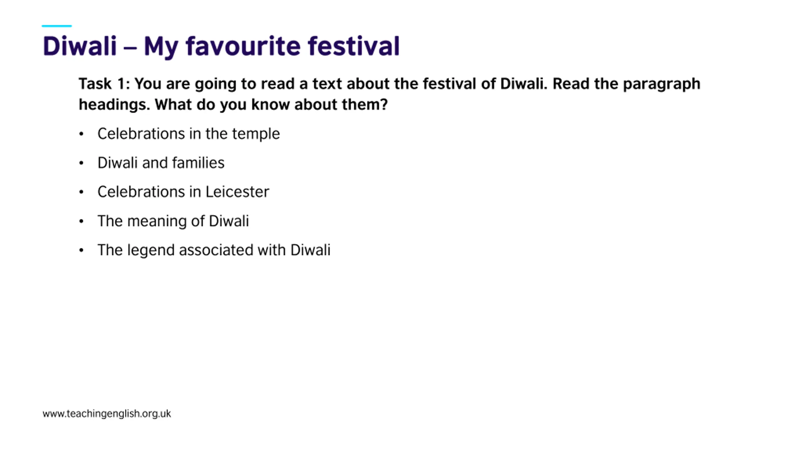 Task 1: You are going to read a text about the festival of Diwali. Read the paragraph headings. What do you know about them? Celebrations in the temple Diwali and families Celebrations in Leicester The meaning of Diwali The legend associated with Diwali www.teachingenglish.org.uk