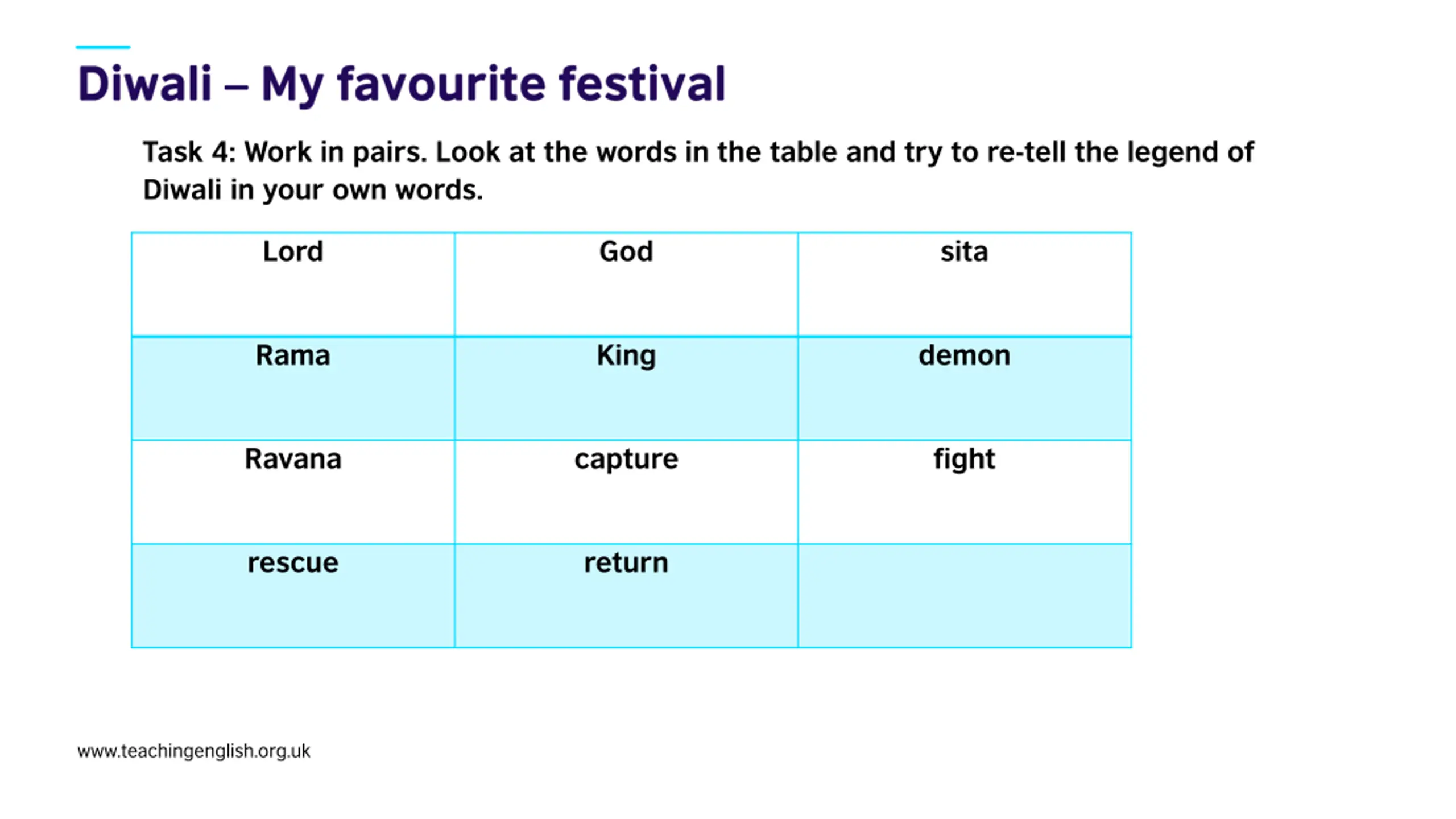 Task 4: Work in pairs. Look at the words in the table and try to re-tell the legend of Diwali in your own words. Lord God sita Rama King demon Ravana capture fight rescue return www.teachingenglish.org.uk