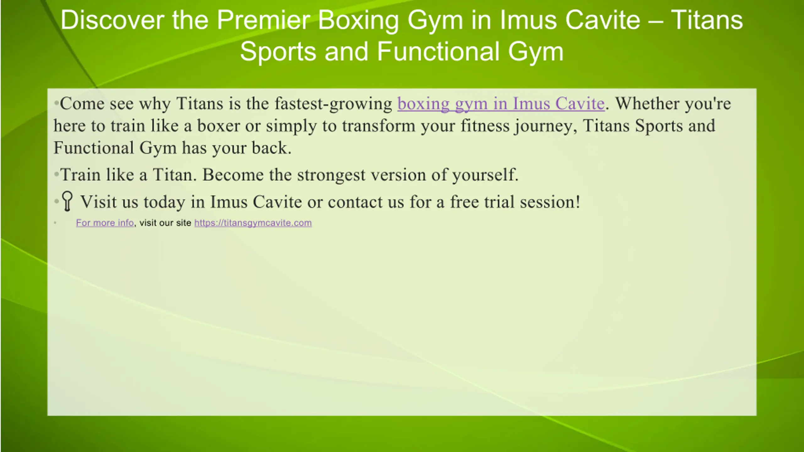 Discover the Premier Boxing Gym in Imus Cavite Titans Sports and Functional Gym Come see why Titans is the fastest-growing boxing gym in Imus Cavite. Whether you're here to train like a boxer or simply to transform your fitness journey, Titans Sports and Functional Gym has your back. Train like a Titan. Become the strongest version of yourself. ? Visit us today in Imus Cavite or contact us for a free trial session! For more info, visit our site https://titansgymcavite.com