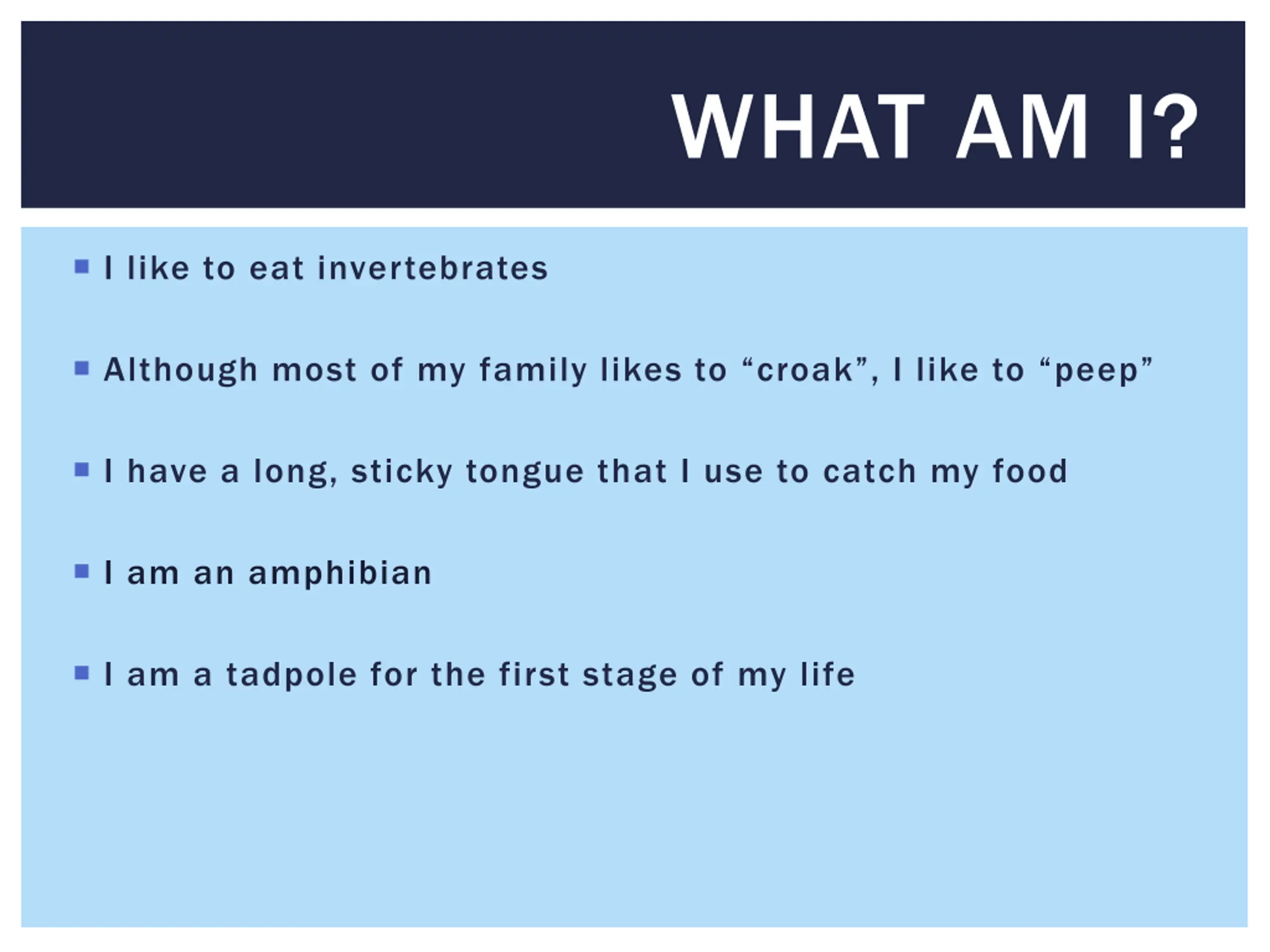 WHAT AM I? I like to eat invertebrates Although most of my family likes to croak , I like to peep I have a long, sticky tongue that I use to catch my food I am an amphibian I am a tadpole for the first stage of my life