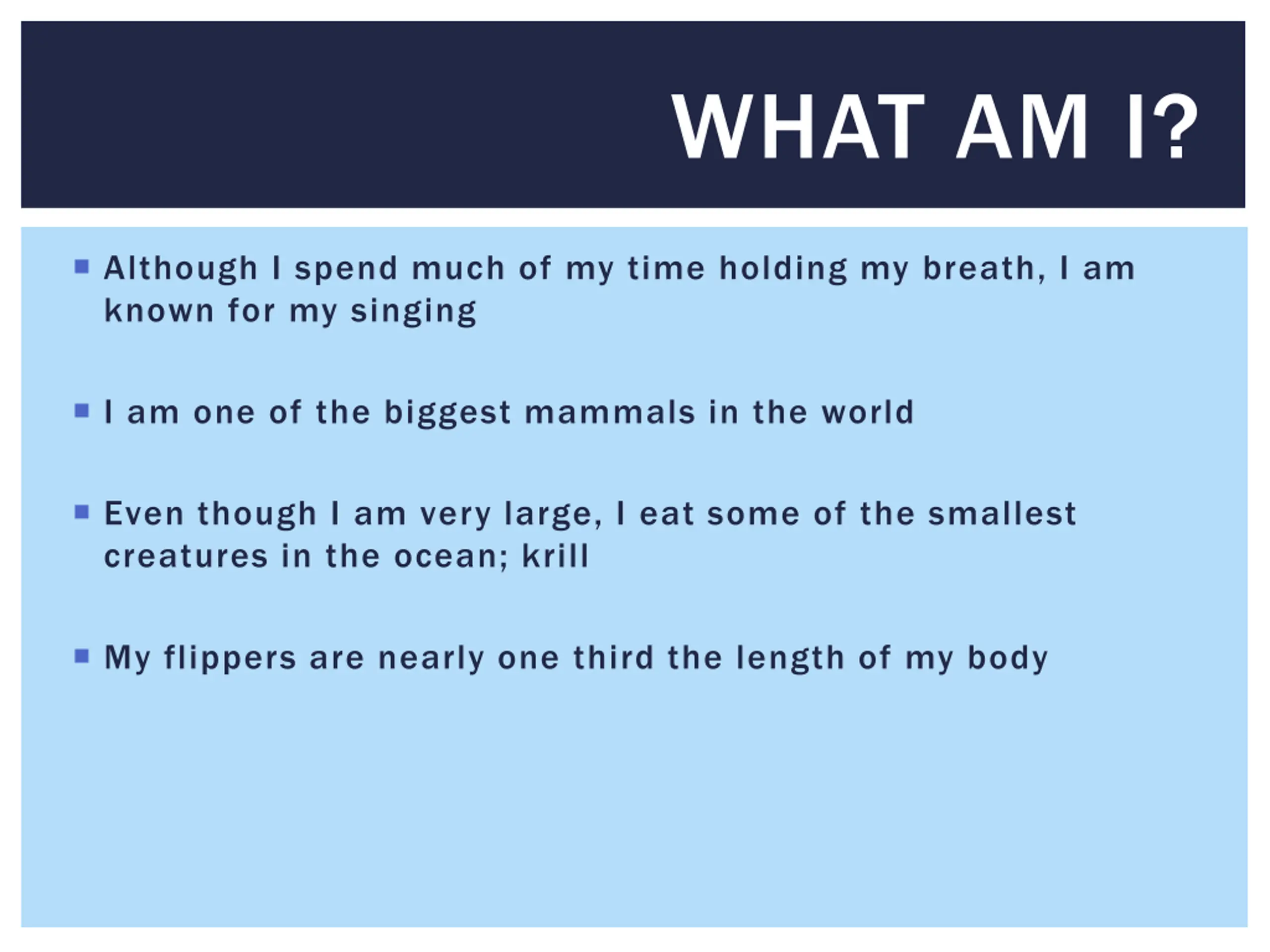WHAT AM I? Although I spend much of my time holding my breath, I am known for my singing I am one of the biggest mammals in the world Even though I am very large, I eat some of the smallest creatures in the ocean; krill My flippers are nearly one third the length of my body