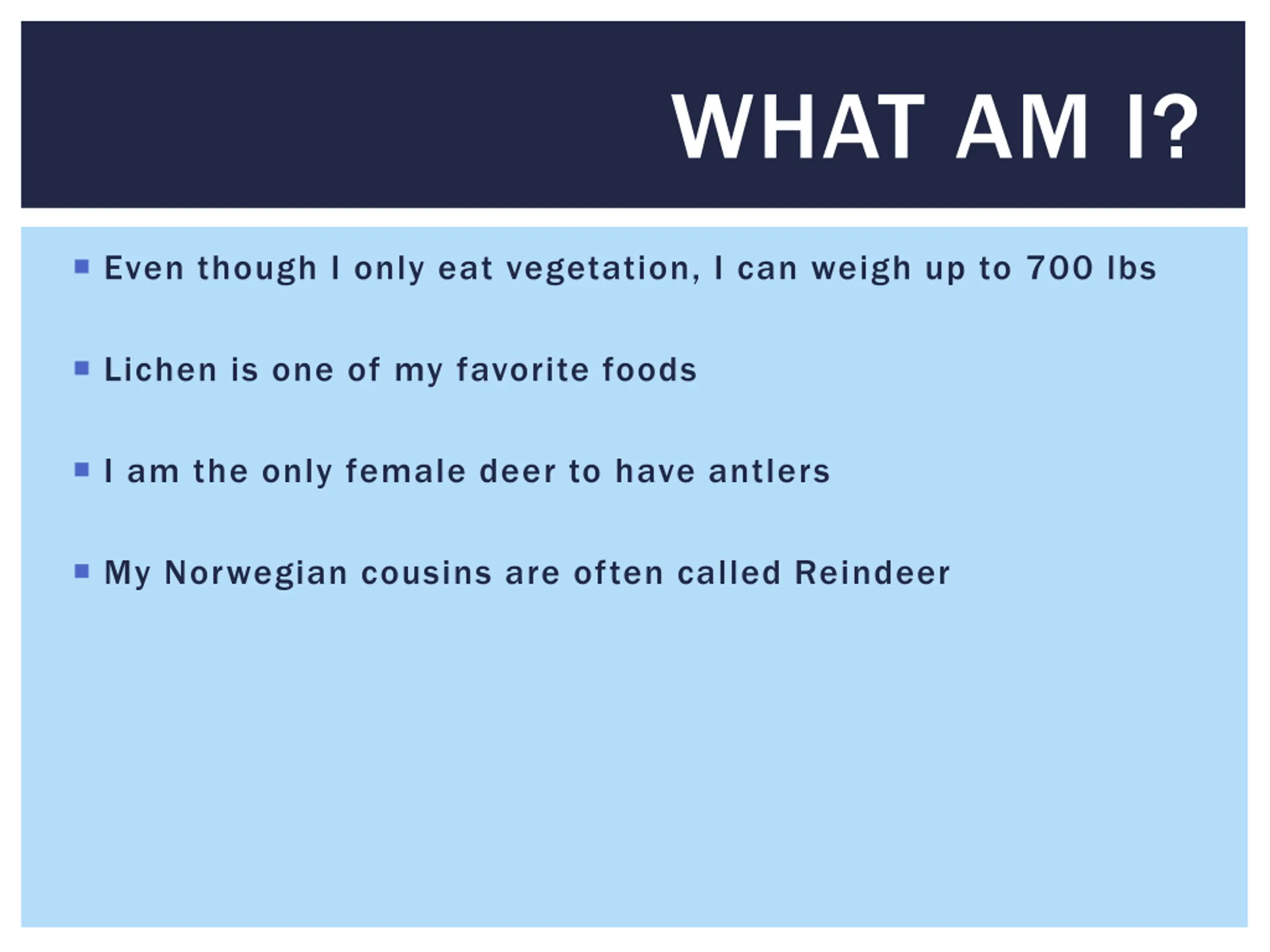 WHAT AM I? Even though I only eat vegetation, I can weigh up to 700 lbs Lichen is one of my favorite foods I am the only female deer to have antlers My Norwegian cousins are often called Reindeer