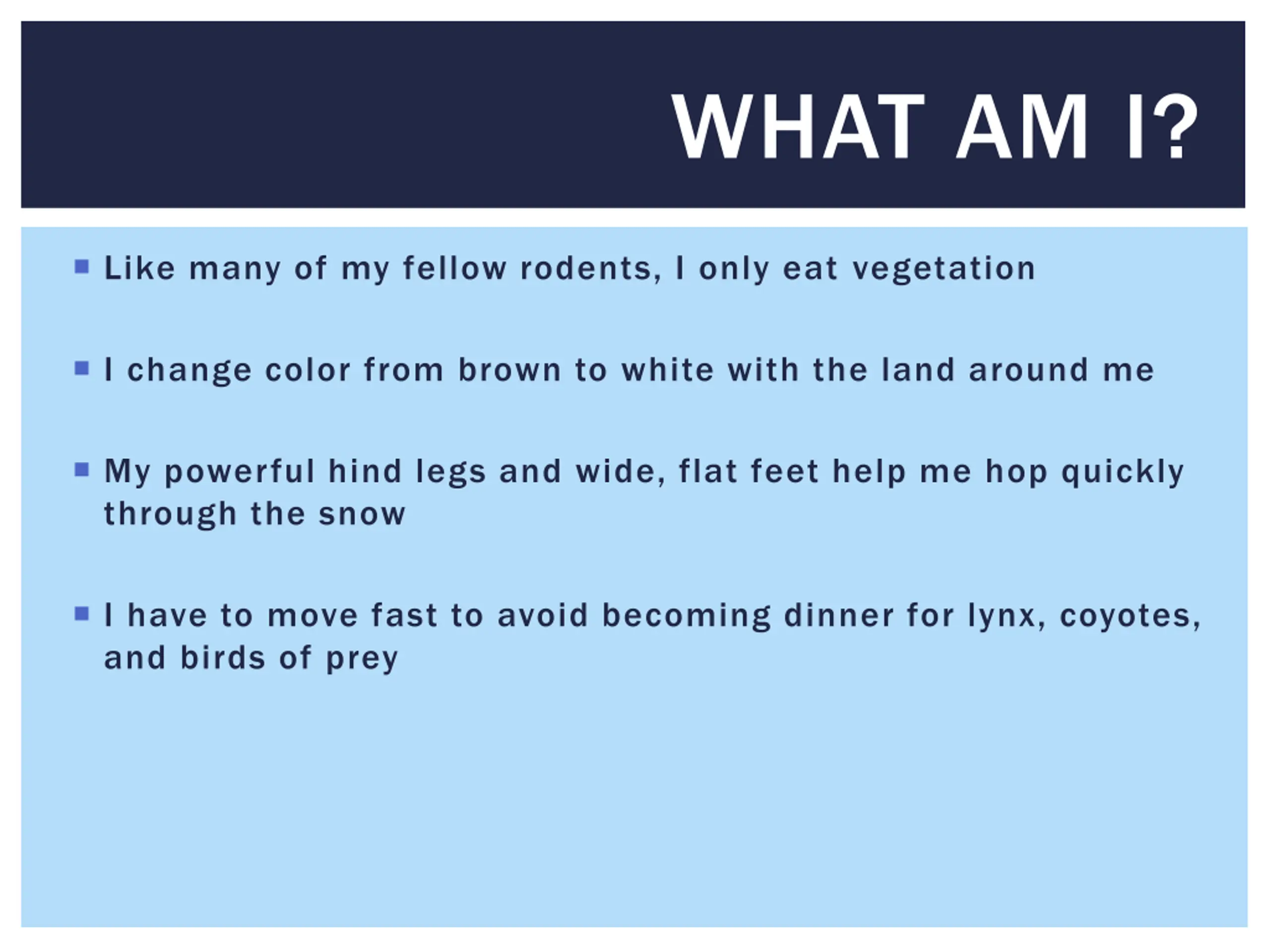 WHAT AM I? Like many of my fellow rodents, I only eat vegetation I change color from brown to white with the land around me My powerful hind legs and wide, flat feet help me hop quickly through the snow I have to move fast to avoid becoming dinner for lynx, coyotes, and birds of prey