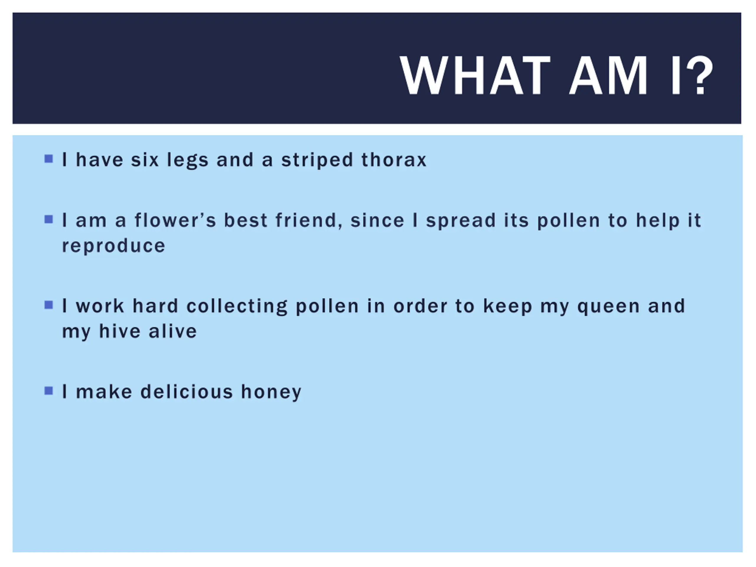 WHAT AM I? I have six legs and a striped thorax I am a flower s best friend, since I spread its pollen to help it reproduce I work hard collecting pollen in order to keep my queen and my hive alive I make delicious honey