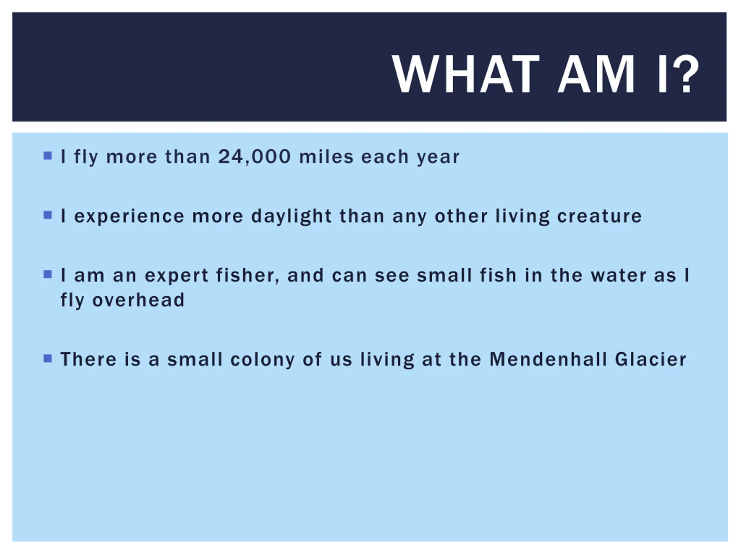 WHAT AM I? I fly more than 24,000 miles each year I experience more daylight than any other living creature I am an expert fisher, and can see small fish in the water as I fly overhead There is a small colony of us living at the Mendenhall Glacier