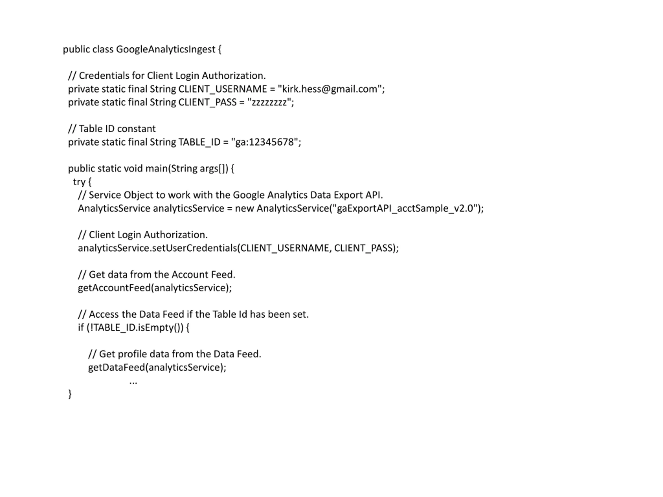 public class GoogleAnalyticsIngest { // Credentials for Client Login Authorization. private static final String CLIENT_USERNAME = "kirk.hess@gmail.com"; private static final String CLIENT_PASS = "zzzzzzzz"; // Table ID constant private static final String TABLE_ID = "ga:12345678"; public static void main(String args[]) { try { // Service Object to work with the Google Analytics Data Export API. AnalyticsService analyticsService = new AnalyticsService("gaExportAPI_acctSample_v2.0"); // Client Login Authorization. analyticsService.setUserCredentials(CLIENT_USERNAME, CLIENT_PASS); // Get data from the Account Feed. getAccountFeed(analyticsService); // Access the Data Feed if the Table Id has been set. if (!TABLE_ID.isEmpty()) { // Get profile data from the Data Feed. getDataFeed(analyticsService); ... }