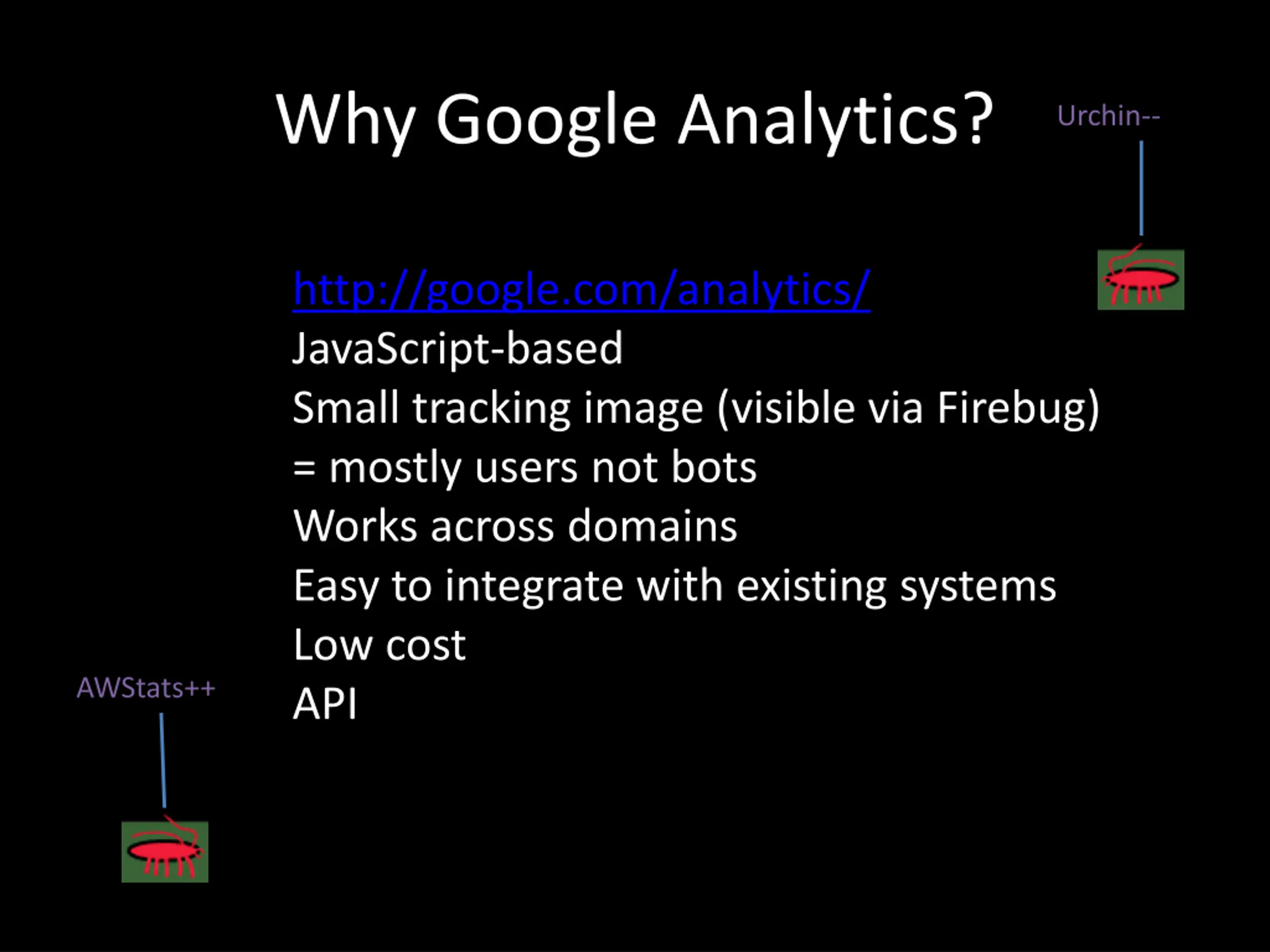 Why Google Analytics? Urchin-- http://google.com/analytics/ JavaScript-based Small tracking image (visible via Firebug) = mostly users not bots Works across domains Easy to integrate with existing systems Low cost API AWStats++