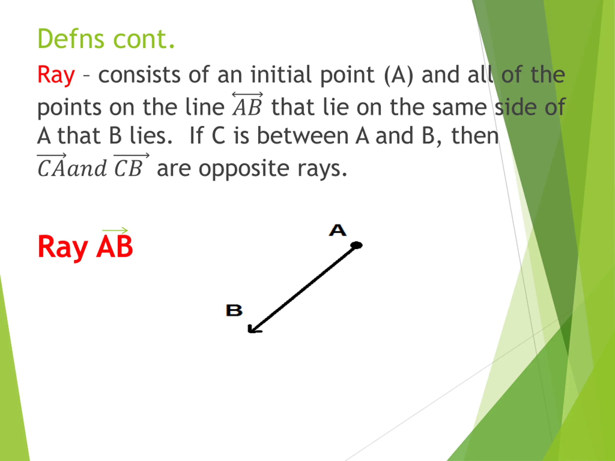 Defns cont. Ray consists of an initial point (A) and all of the points on the line ?? that lie on the same side of A that B lies. If C is between A and B, then ????? ?? are opposite rays. Ray AB
