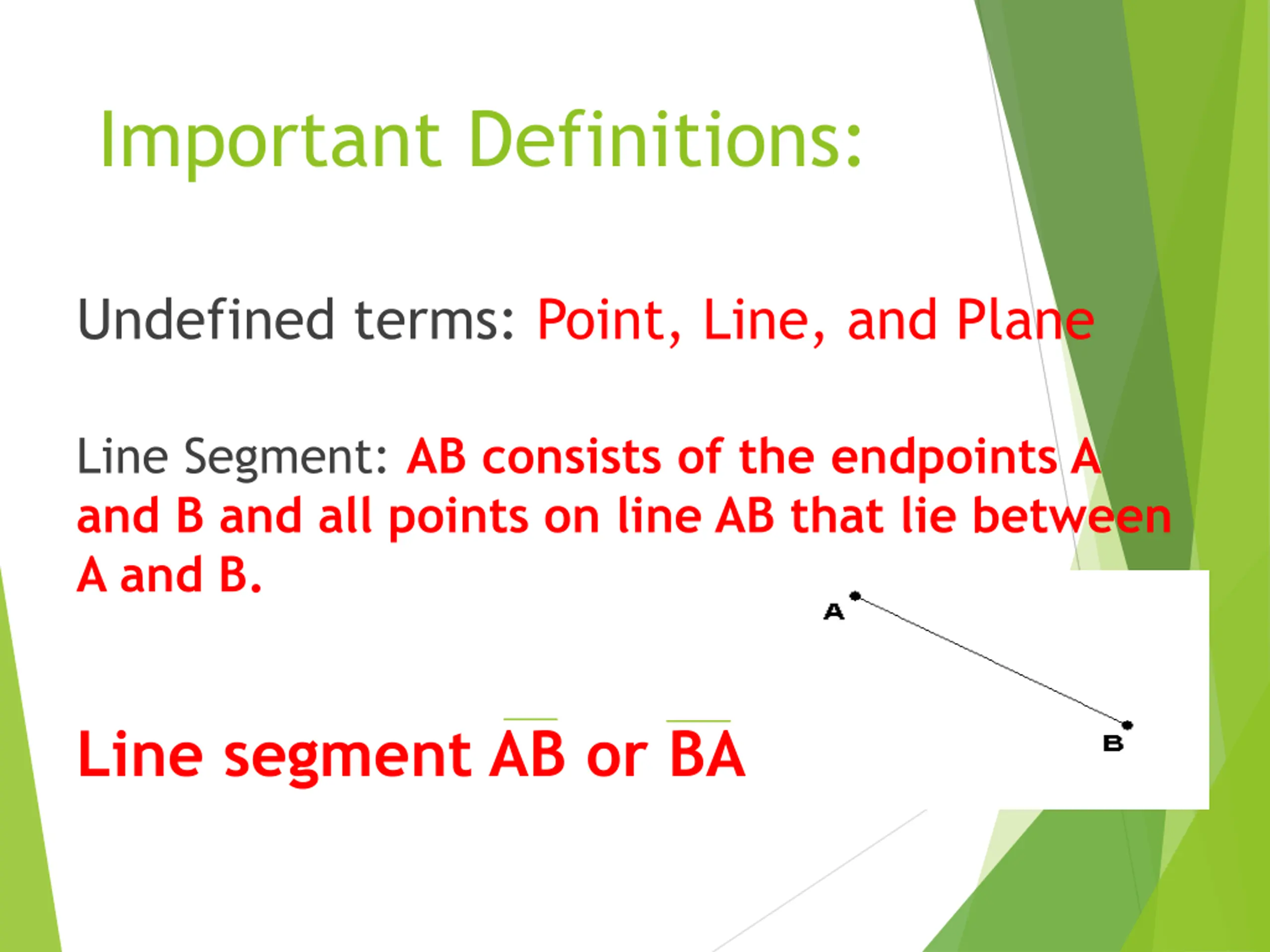 Important Definitions: Undefined terms: Point, Line, and Plane Line Segment: AB consists of the endpoints A and B and all points on line AB that lie between A and B. Line segment AB or BA