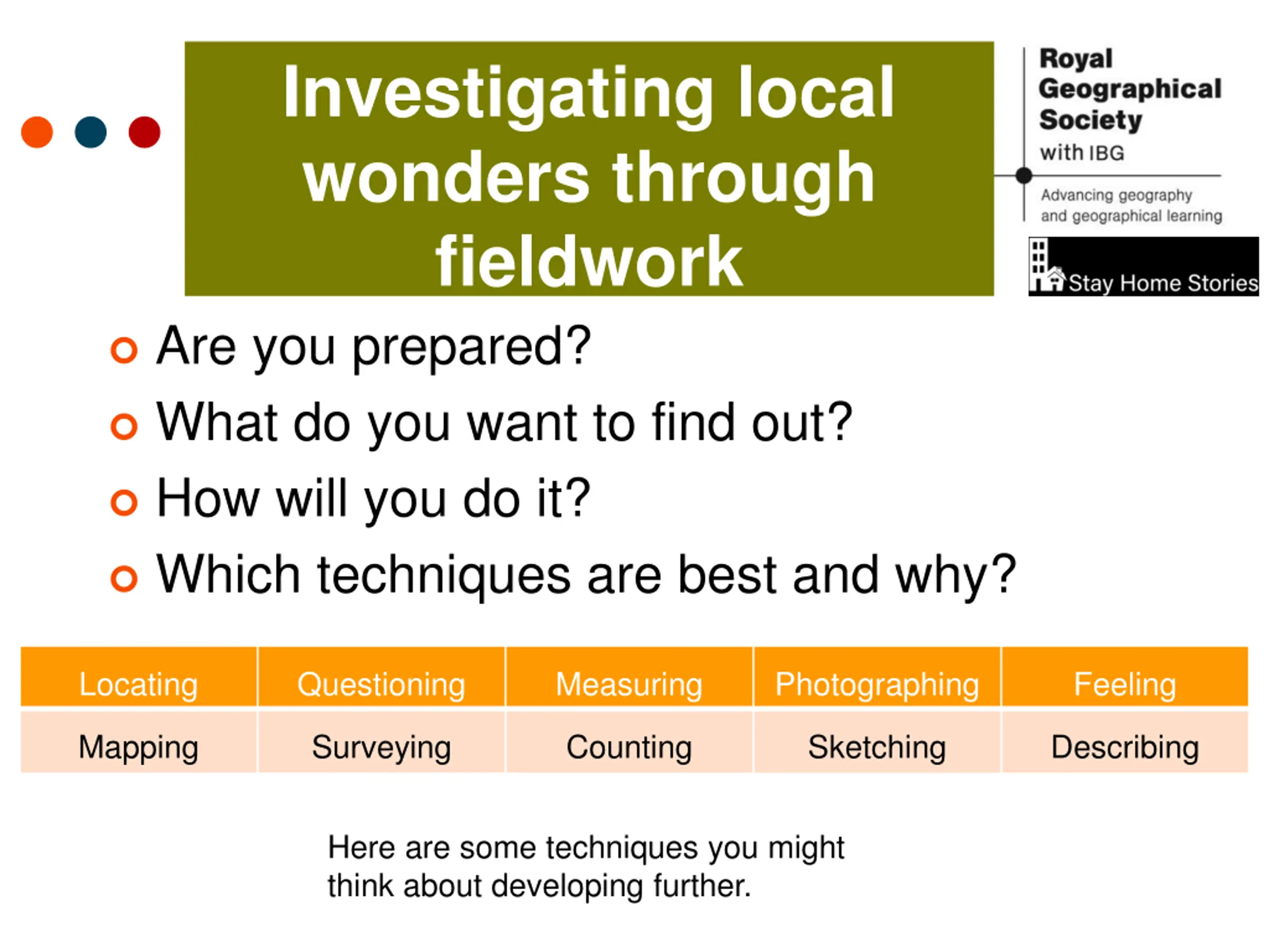 Investigating local wonders through fieldwork Are you prepared? What do you want to find out? How will you do it? Which techniques are best and why? Locating Questioning Measuring Photographing Feeling Mapping Surveying Counting Sketching Describing Here are some techniques you might think about developing further.