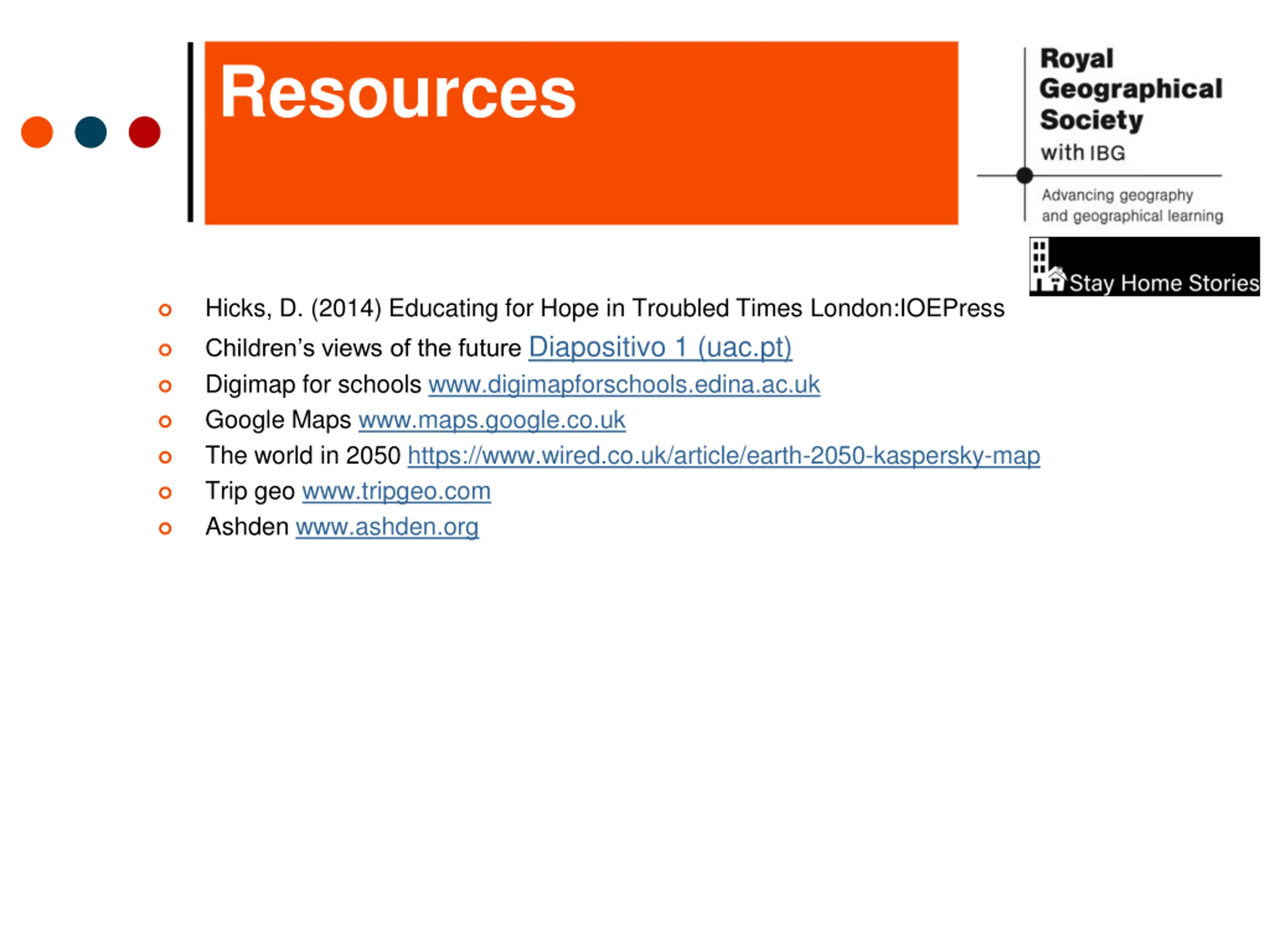 Resources Hicks, D. (2014) Educating for Hope in Troubled Times London:IOEPress Children s views of the future Diapositivo 1 (uac.pt) Digimap for schools www.digimapforschools.edina.ac.uk Google Maps www.maps.google.co.uk The world in 2050 https://www.wired.co.uk/article/earth-2050-kaspersky-map Trip geo www.tripgeo.com Ashden www.ashden.org
