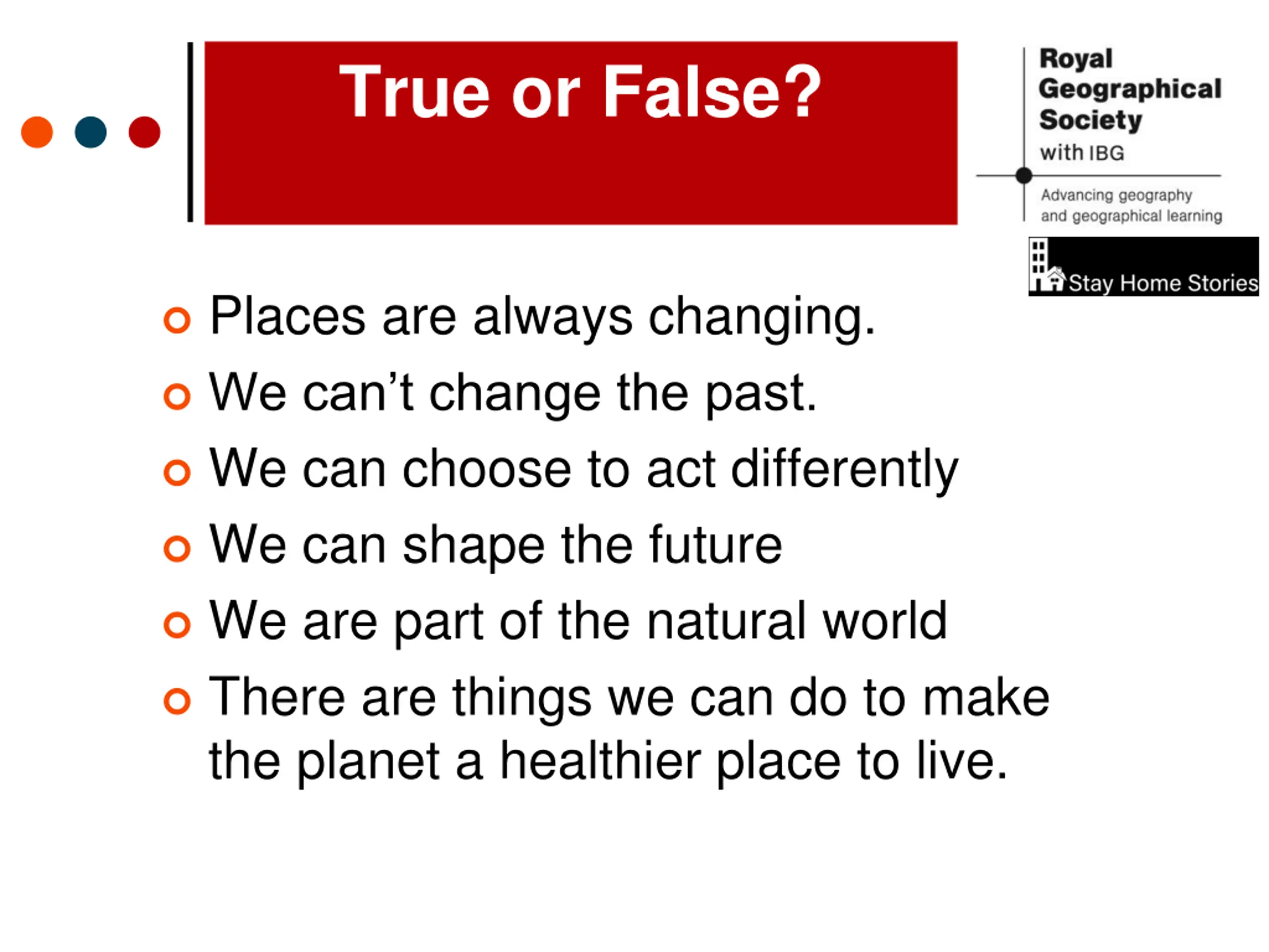 True or False? Places are always changing. We can t change the past. We can choose to act differently We can shape the future We are part of the natural world There are things we can do to make the planet a healthier place to live.