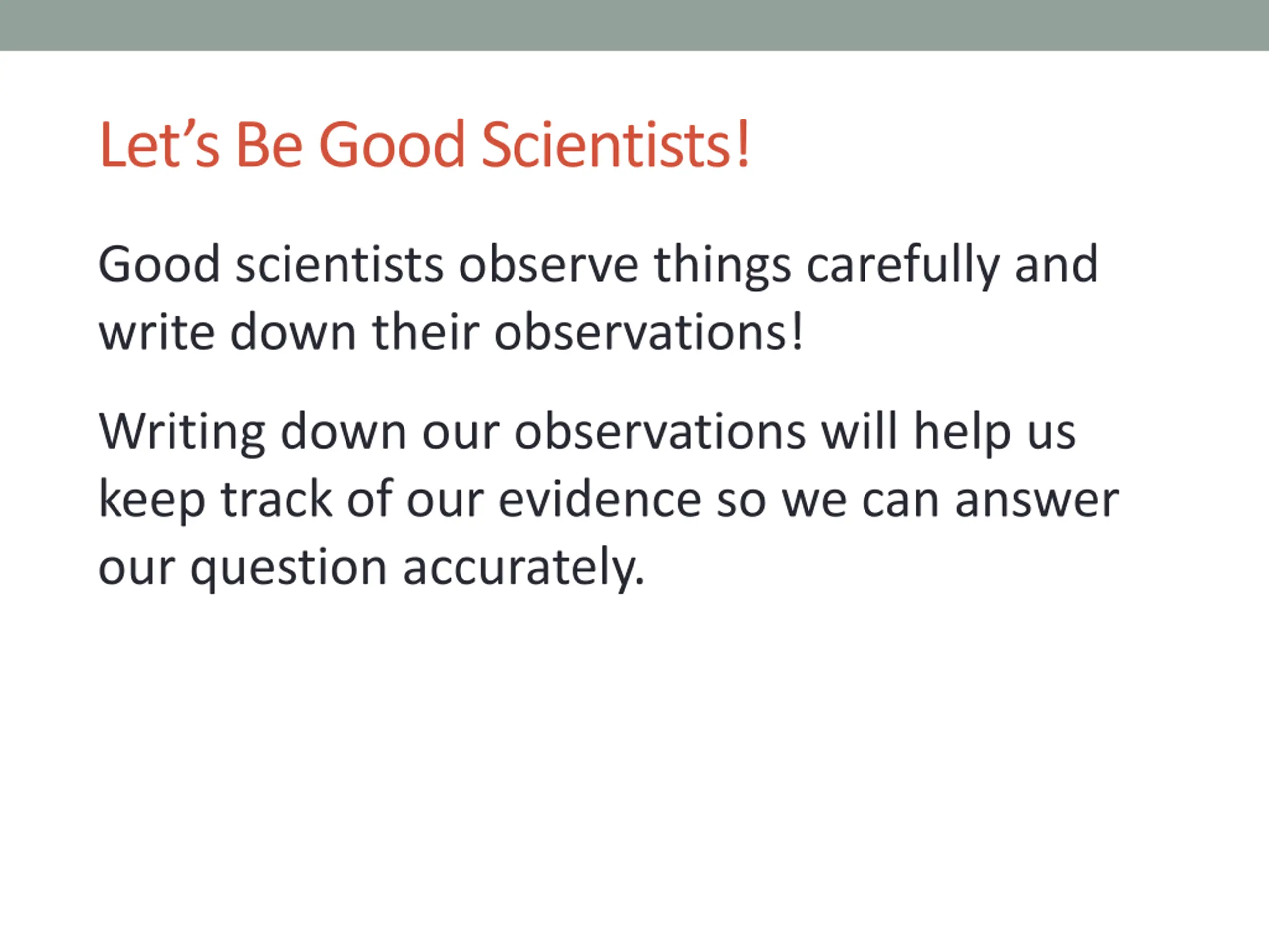 Lets Be Good Scientists! Good scientists observe things carefully and write down their observations! Writing down our observations will help us keep track of our evidence so we can answer our question accurately.