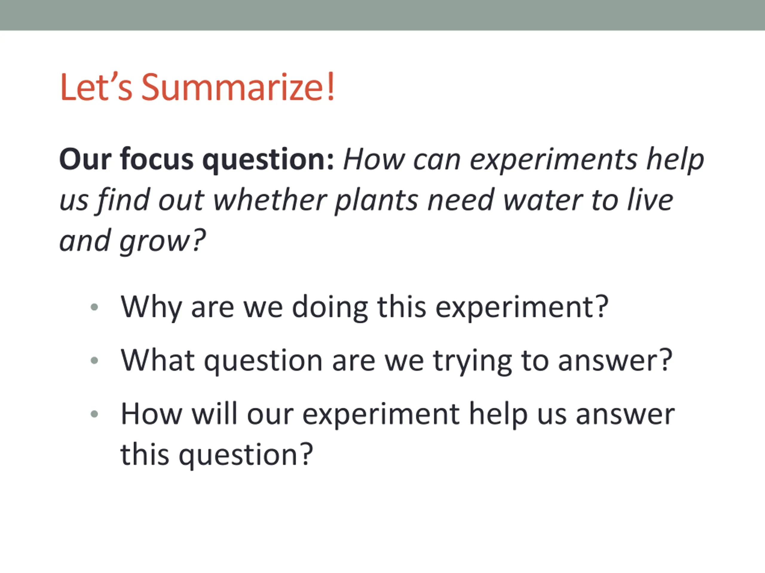 Lets Summarize! Our focus question: How can experiments help us find out whether plants need water to live and grow? Why are we doing this experiment? What question are we trying to answer? How will our experiment help us answer this question?
