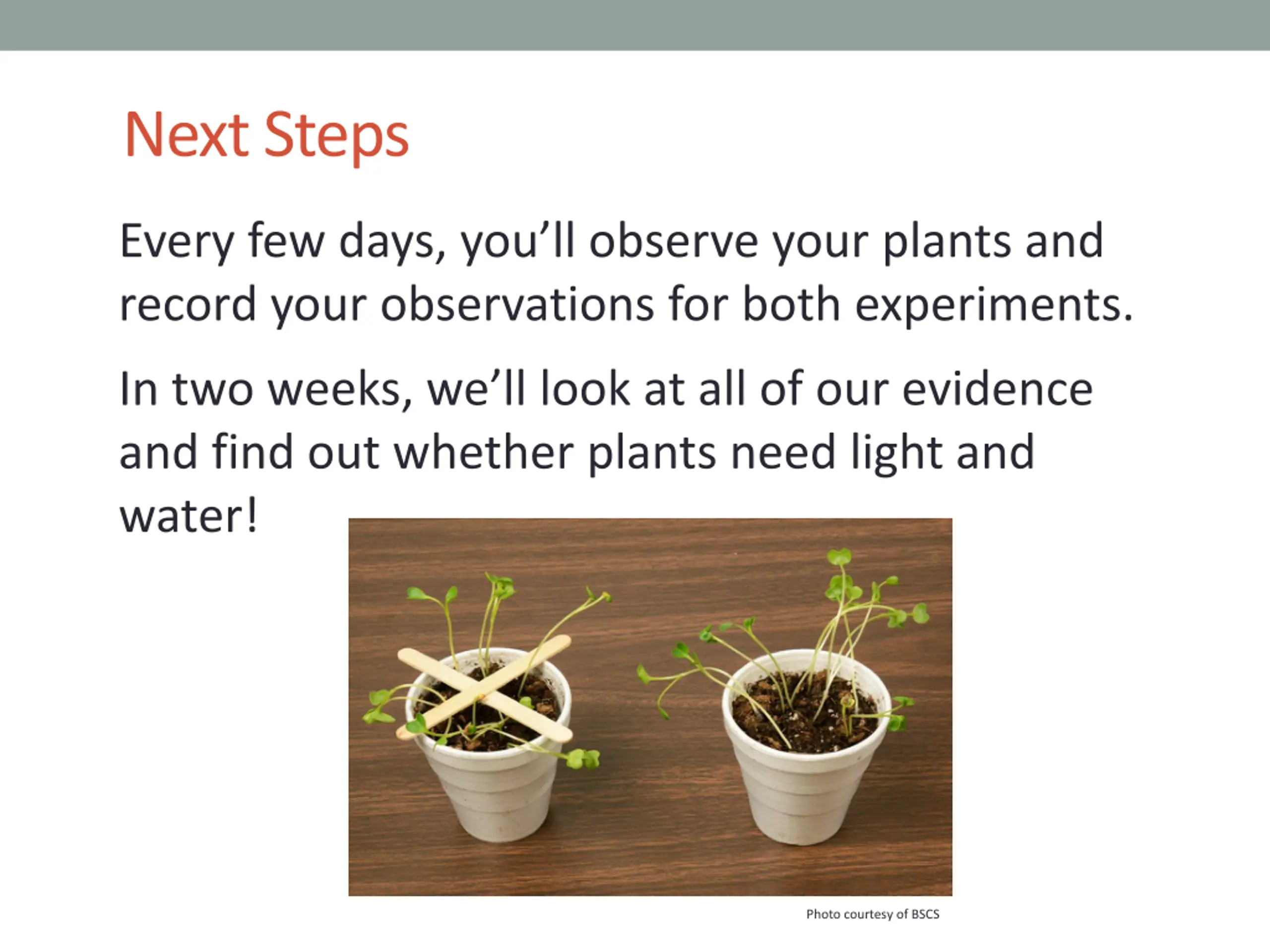 Next Steps Every few days, you ll observe your plants and record your observations for both experiments. In two weeks, we ll look at all of our evidence and find out whether plants need light and water! Photo courtesy of BSCS